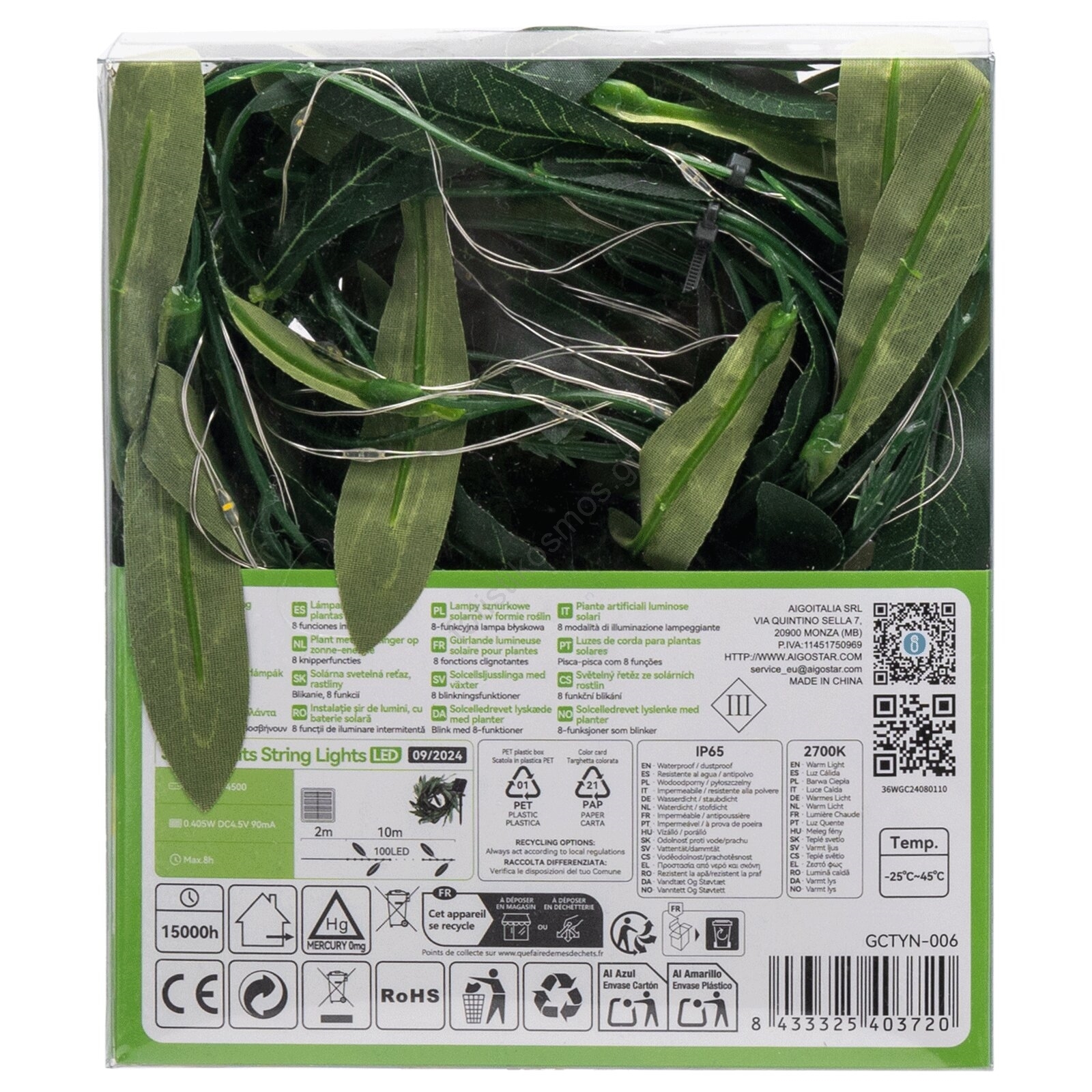 Aigostar - LED ηλιακή σειρά 100xLED/12μ IP65 ζεστό λευκό ελιά | Fotisti kosmos