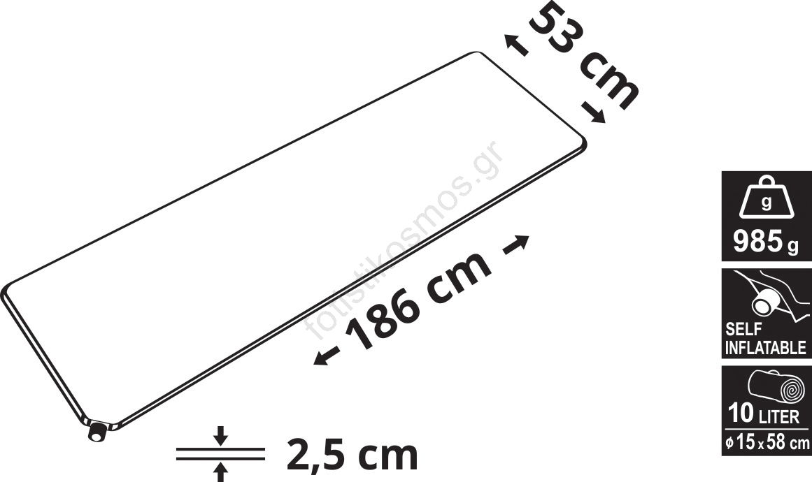 • Το υπόστρωμα που φουσκώνει μόνο του, διαθέτει έναν πυρήνα αφρού υψηλής πυκνότητος, ο οποίος είναι πλαστικοποιημένος σε ένα αδιαπέραστο ύφασμα.