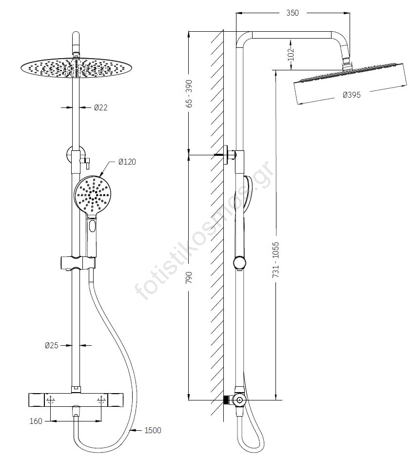 • Κολώνα ντους και ανώτερο ντους από ανοξείδωτο ατσάλι με επιφανειακή επεξεργασία PVD.