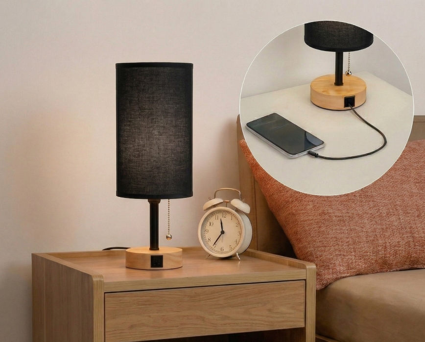 • Brilagi - Επιτραπέζιο φωτιστικό με θύρα USB TABLON 1xE27/25W/230V δρυς/μαύρο