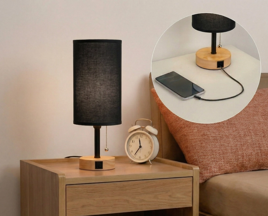 • Brilagi - Επιτραπέζιο φωτιστικό με θύρα USB TABLON 1xE27/25W/230V δρυς/μαύρο/κρεμ