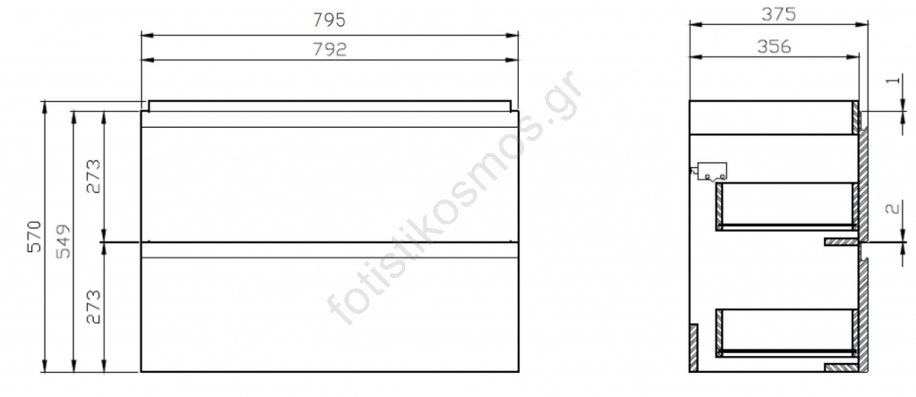 • Η ντουλάπα διαθέτει δύο ευρύχωρα συρτάρια με μηχανισμό αθόρυβου κλεισίματος και κρυφά χερούλια.