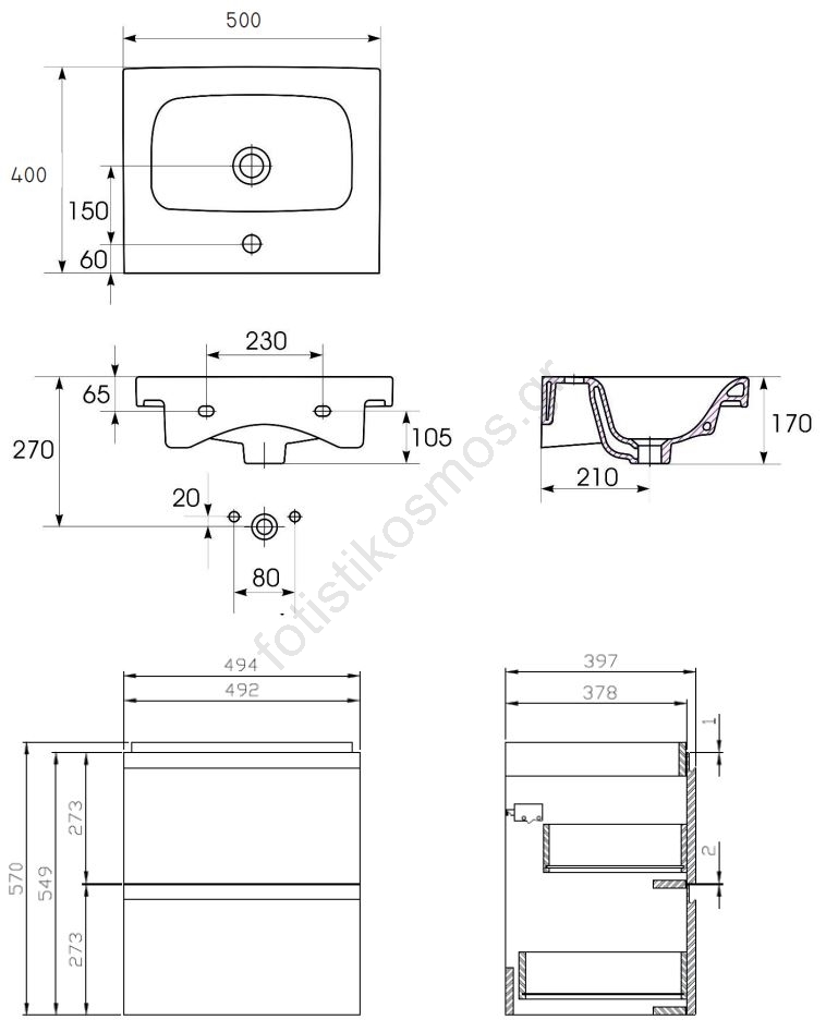 • Ο κεραμικός νιπτήρας έχει κλασικό ορθογώνιο σχήμα με οπή για τη βρύση και υπερχείλιση.