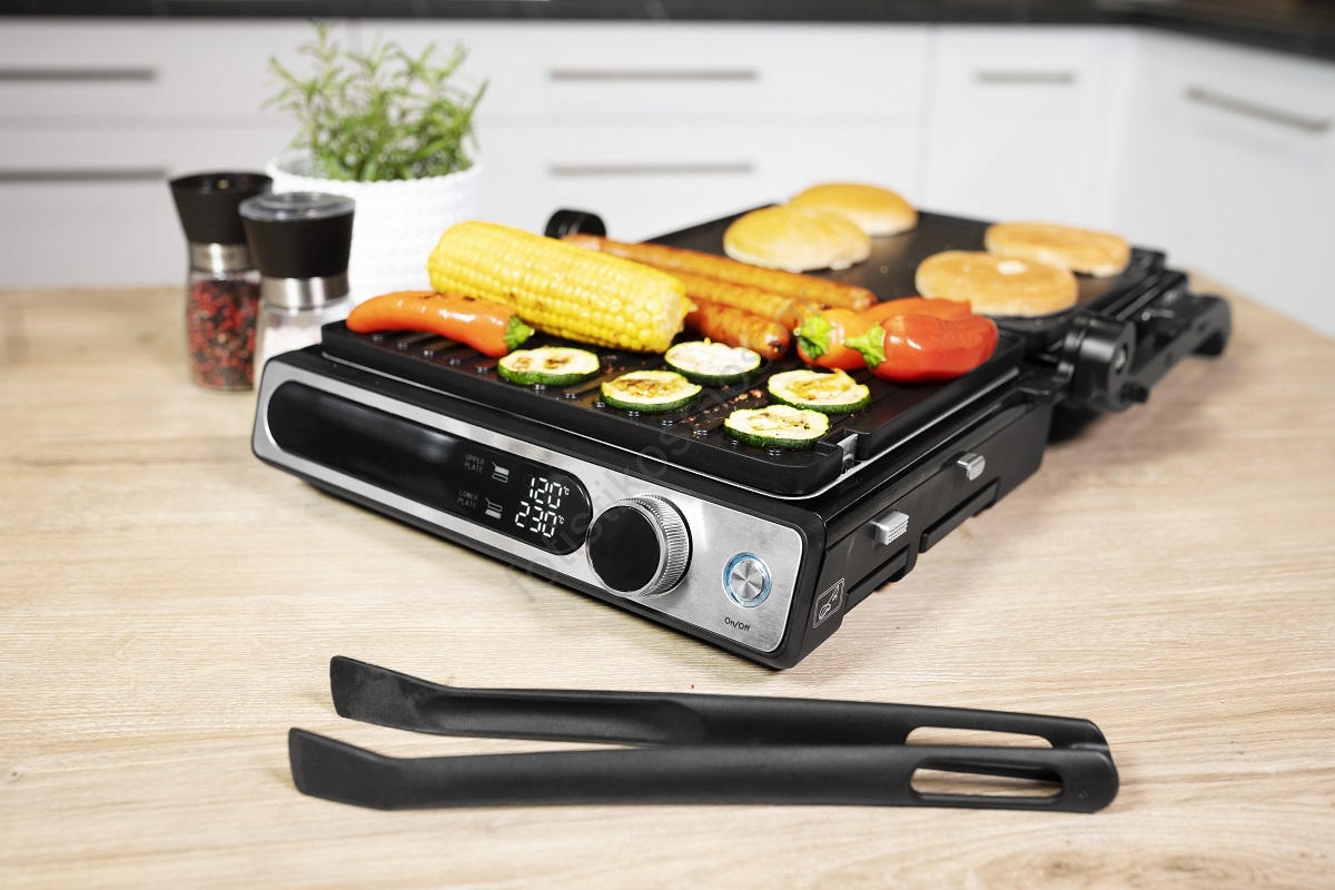 • 2 ζεύγη αντικολλητικών πλακών (1 ζεύγος διπλής όψης ψησταριά/panini + λεία πλάκα για τηγανίτες/κρέπες) που μπορούν να πλυθούν άνετα στο πλυντήριο πιάτων.