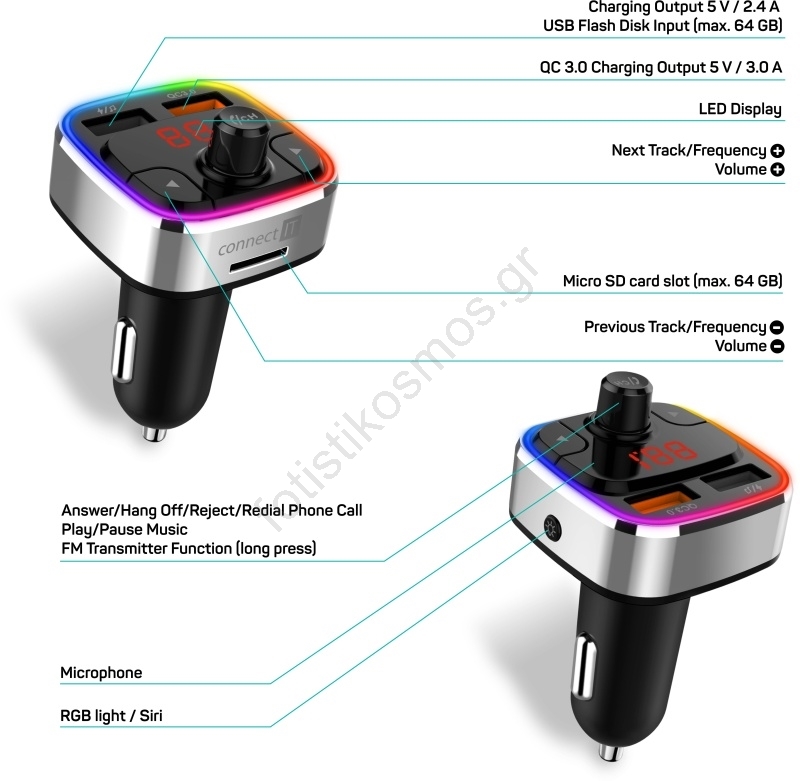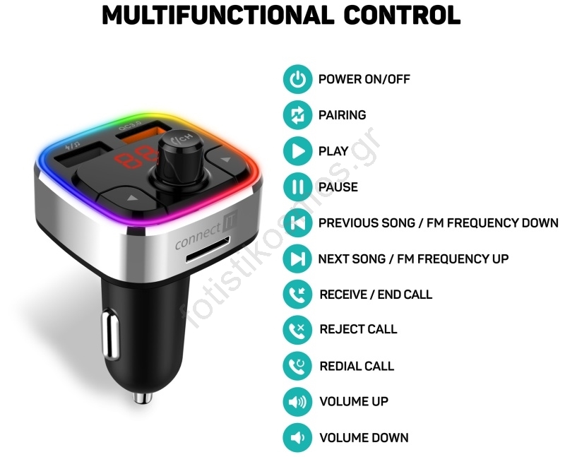 • Πομπός FM που συνδυάζει τρεις συσκευές σε μία - φορτιστής USB με δύο θύρες και λειτουργία γρήγορης φόρτισης Quick Charge 3.0, ασύρματο Bluetooth handsfree και μουσικό αναπαραγωγέα.