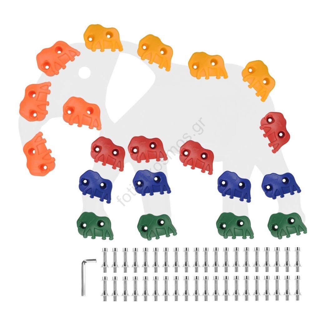 • Πολύχρωμες, με σχέδια ελεφάντων, λαβές αναρρίχησης που συμπληρώνουν κάθε παιδικό αναρριχητικό τοίχο.