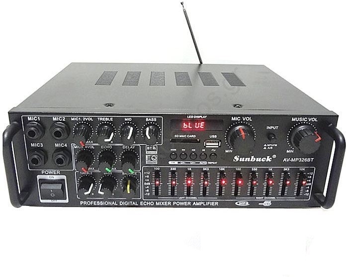 • Ενισχυτής ήχου με ισοσταθμιστή, Bluetooth, αναπαραγωγέα MP3 (υποδοχή USB ή SD), ραδιόφωνο FM, όλα με τηλεχειριστήριο.