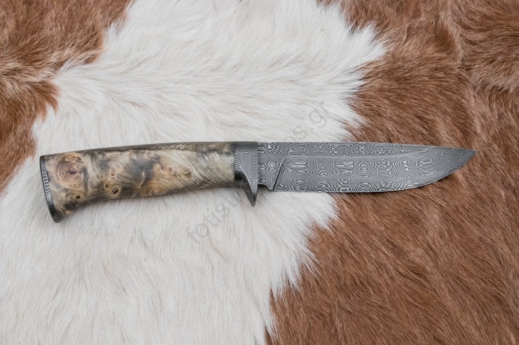 • Η λεπίδα και η προστασία είναι σφυρηλατημένες από δαμασκηνό χάλυβα που σχηματίζει διακοσμητικά μωσαϊκά.