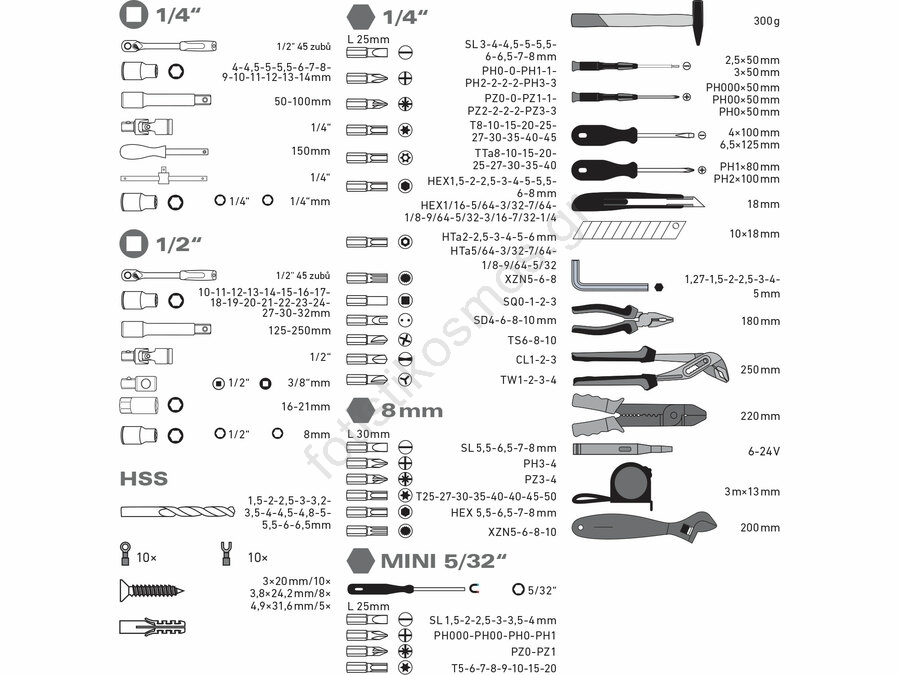 • Μύτες: 1/4" (L25mm): (-)3-4-4,5-5-5,5-6-6,5-7-8mm, PH0-0-1-2-2-2-2-3-3, PZ0-0-1-1-2-2-2-2-3-3, T8-10-15-20-25-27-30-35-40-45, TTa8-10-15-20-25-27-30-35-40, H1,5-2-2,5-3-4-5-5,5-6-8mm,H1/16-5/64-3/32-7/64-1/8-9/64-5/32-3/16-7/32-1/4", HTa2-2.5-3-4-5-6mm, HTa 5/64-3/32-7/64-1/8-9/66-5/32mm, XZN5-6-8,SQ0-1-2-3,SD4-6-8-10mm, TS6-8-10, CL1-2-3, TW1-2-3-4- 8mm: (-) 5.5-6.5-7-8mm, PH3-4, PZ3-4, H5.5-6.5-7-8mm, T25-27-30-40-45-50, XZN5-6-8-10.