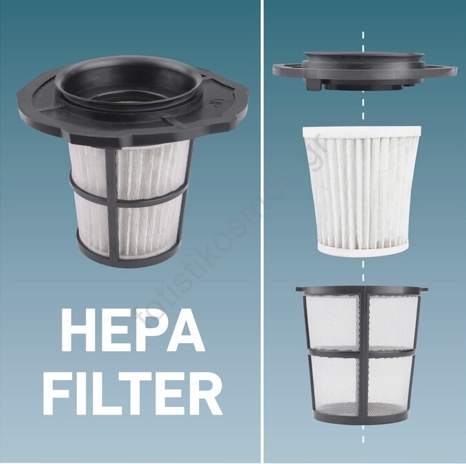 • Η σκούπα διαθέτει προφίλτρο δικτύου και λεπτό φίλτρο HEPA με υψηλή αποδοτικότητα φιλτραρίσματος.