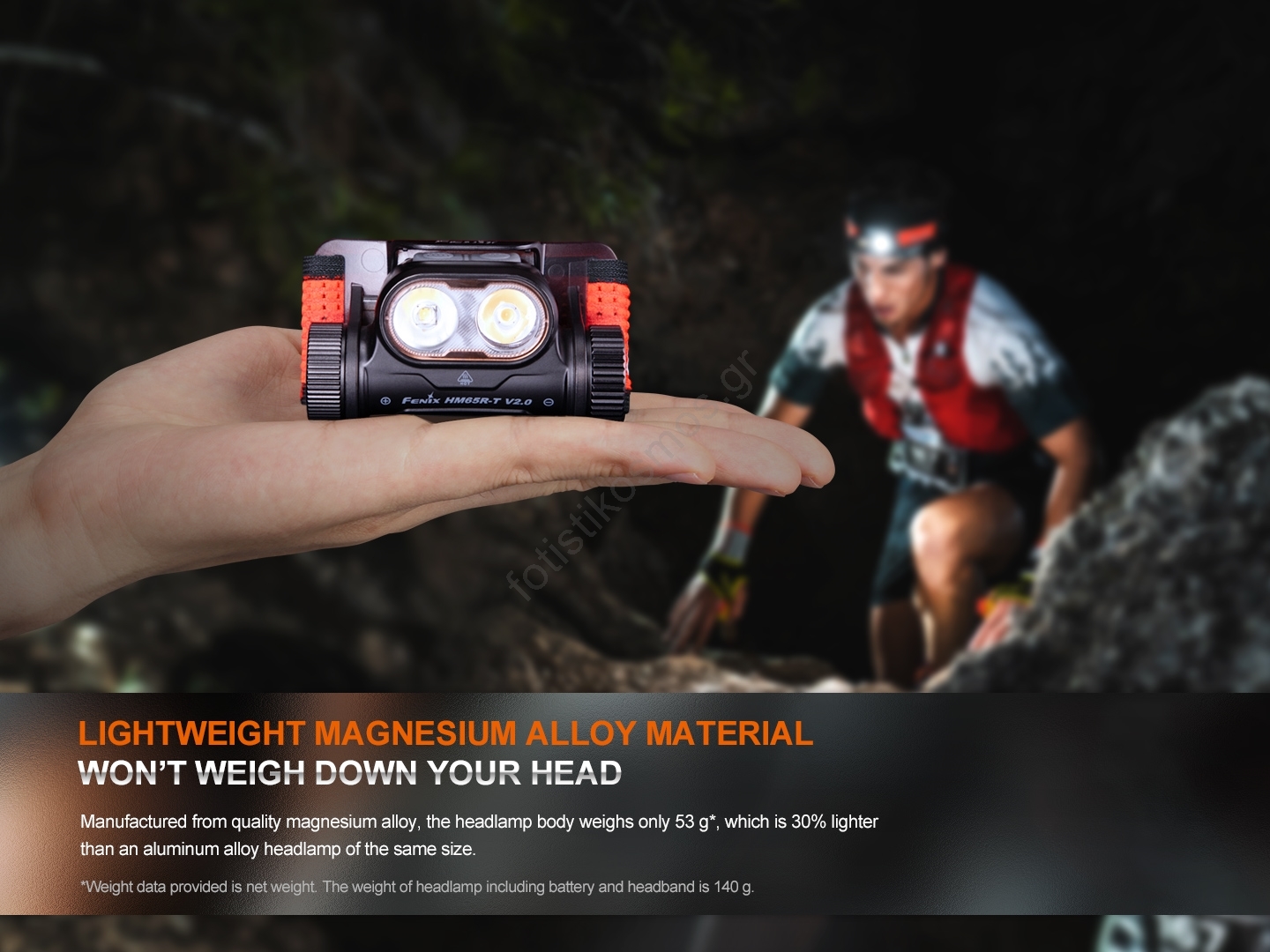 • Η επαναφορτιζόμενη φακός κεφαλής Fenix HM65R-T V2.0 ξεχωρίζει για το ελαφρύ πλαίσιο από κράμα μαγνησίου, την υψηλή αντοχή στο νερό και στις πτώσεις, τον μοναδικό σχεδιασμό με δύο ανακλαστήρες και την φωτεινότητα έως 1600 lumen.