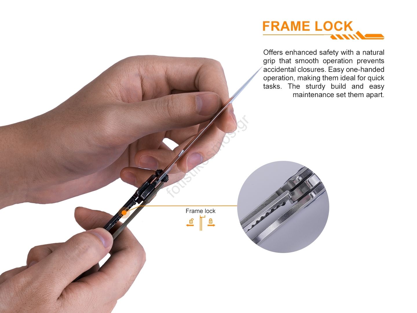 • Για αποφυγή ακούσιου κλεισίματος, το μαχαίρι διαθέτει μηχανισμό ασφάλισης frame lock.
