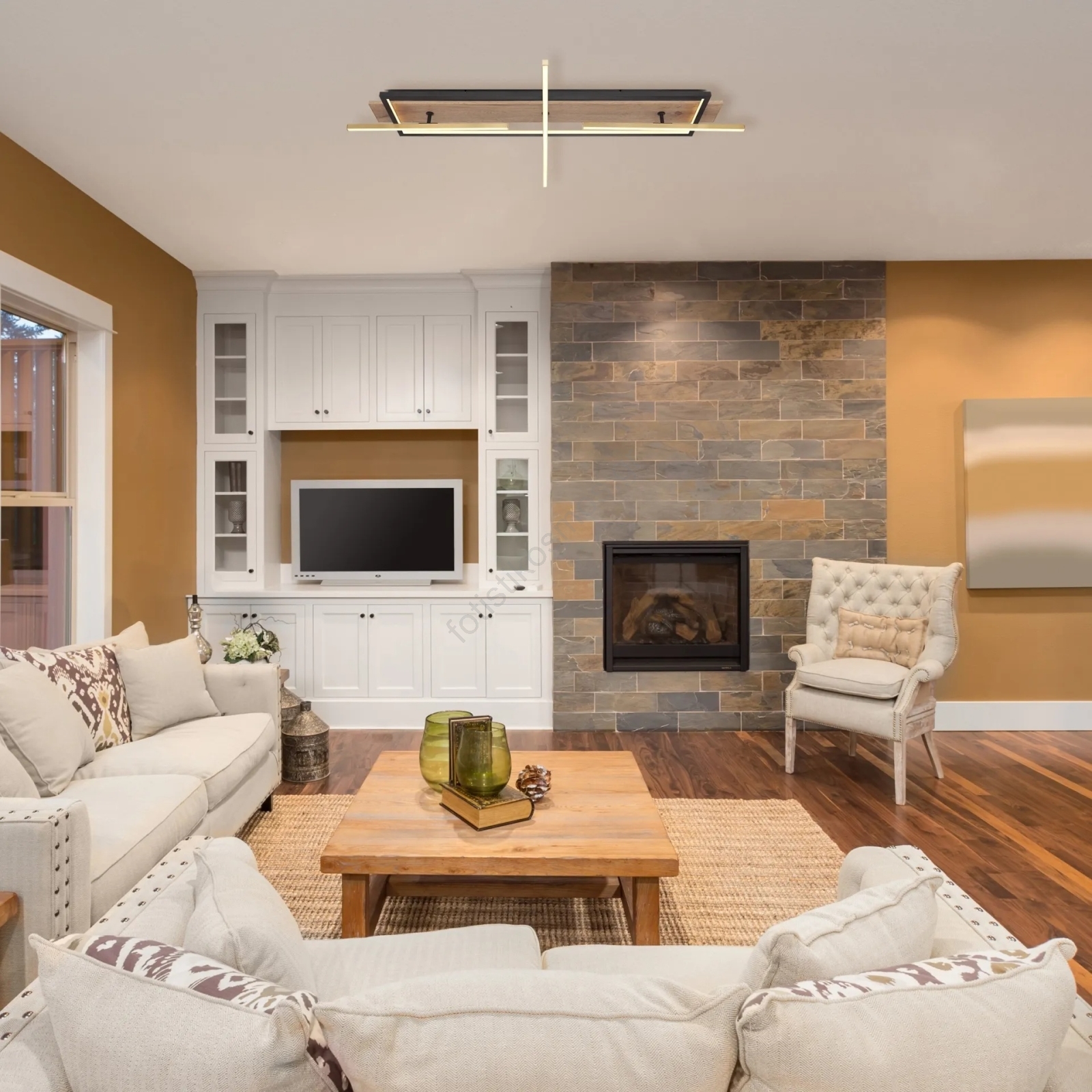 • Το φωτιστικό οροφής διαθέτει ματ μαύρο μεταλλικό περίβλημα σε συνδυασμό με σκούρες λεπτομέρειες από MDF και αλουμινένιες ράβδους σε απόχρωση ορείχαλκου, που προσδίδουν στο χώρο σας κομψή και σύγχρονη εμφάνιση.