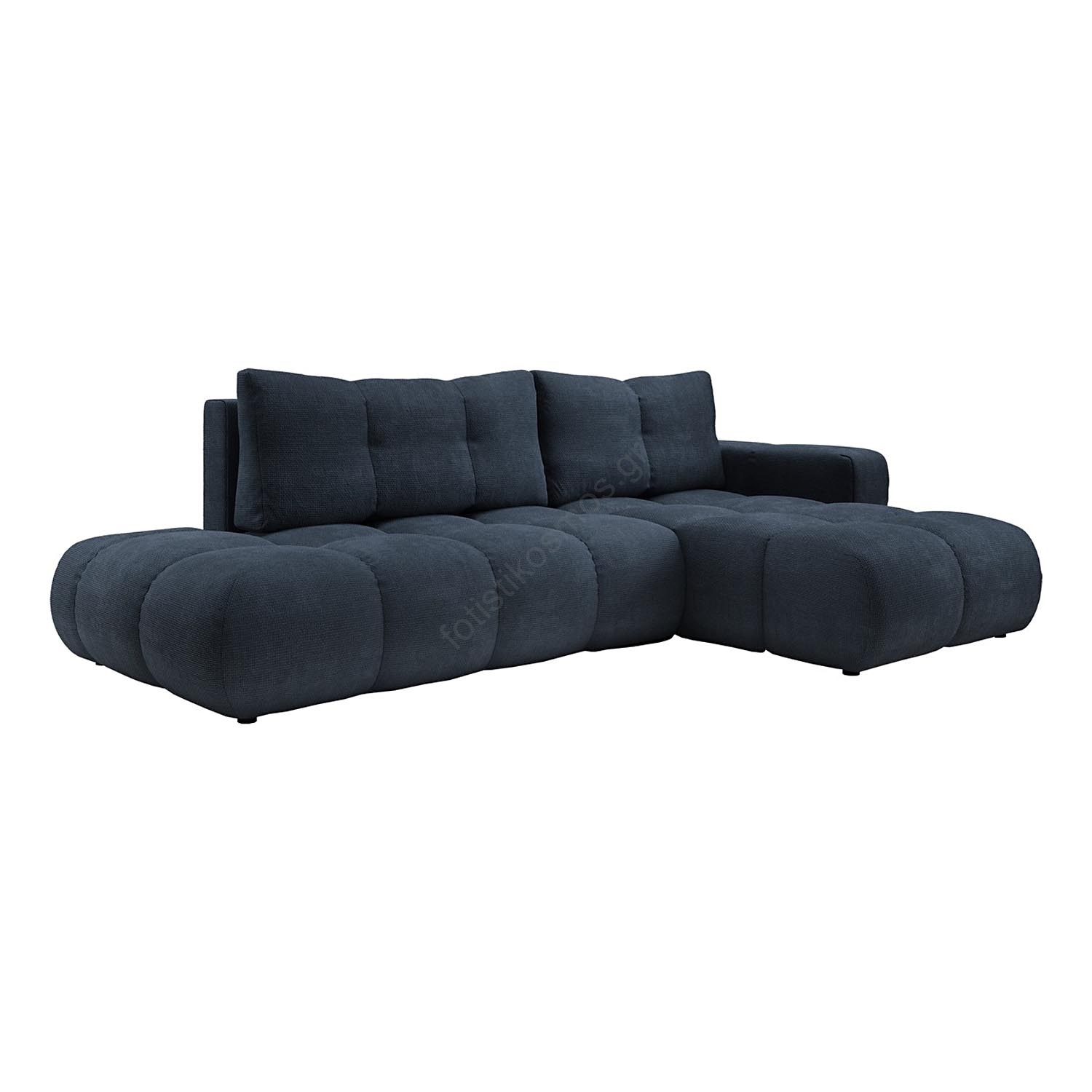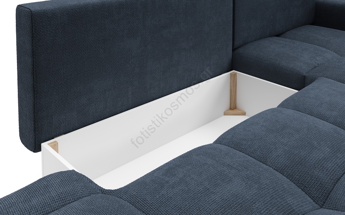 Αναδιπλούμενη γωνιακή επενδυμένη σύνθεση καθιστικού σε σχήμα L ALMADA, δεξιά, μπλε, με αποθηκευτικό χώρο