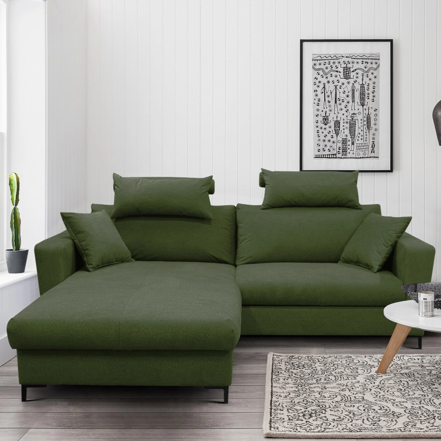• Αναδιπλούμενος γωνιακός καναπές-κρεβάτι με αποθηκευτικό χώρο σε σχήμα L HORTA αριστερός πράσινος
