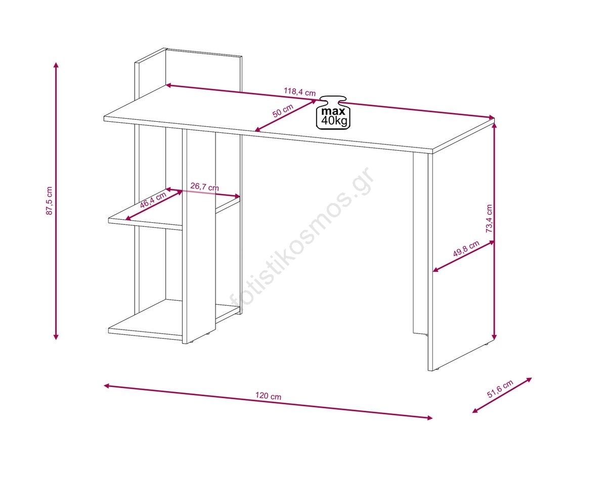 • Η ορθογώνια επιφάνεια εργασίας στηρίζεται σε πλάγια ραφιέρα με δύο ανοιχτά ράφια, ιδανικά για φύλαξη βιβλίων, γραφικής ύλης ή διακοσμητικών.