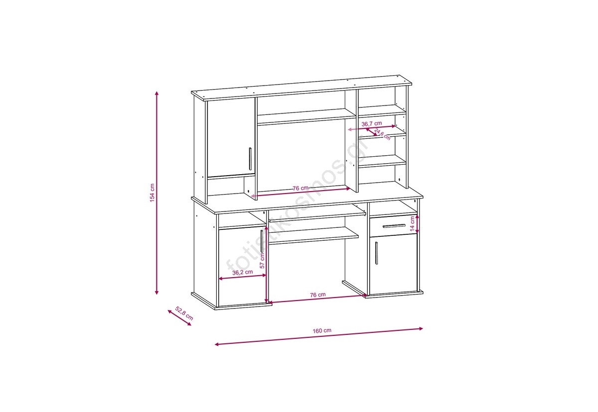 • Προσφέρει ευρύχωρη επιφάνεια, συρόμενη θήκη για το πληκτρολόγιο και πολλούς χώρους αποθήκευσης, όπως κλειστά ντουλάπια, ανοιχτά ράφια και κάθετες θήκες.