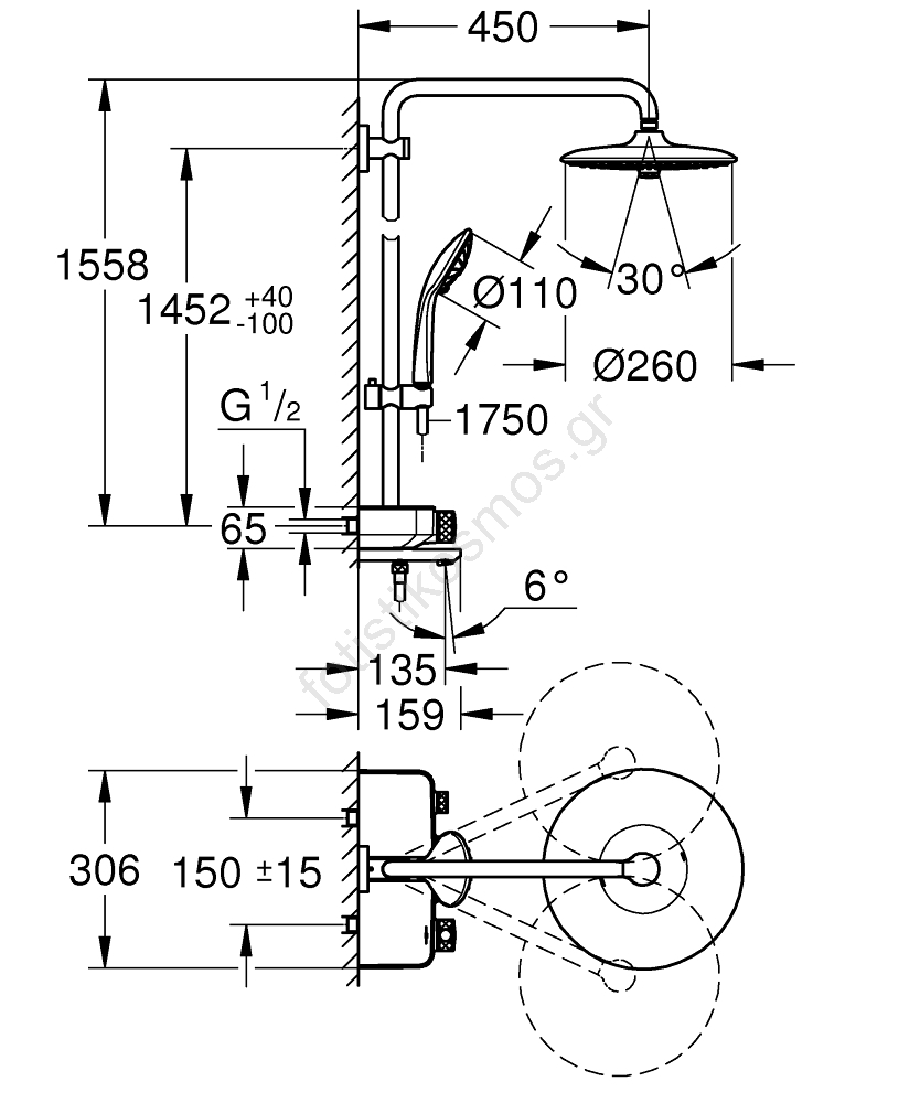 • Οριζόντιος περιστρεφόμενος βραχίονας ντους μήκους 450 mm για ευέλικτη ρύθμιση.