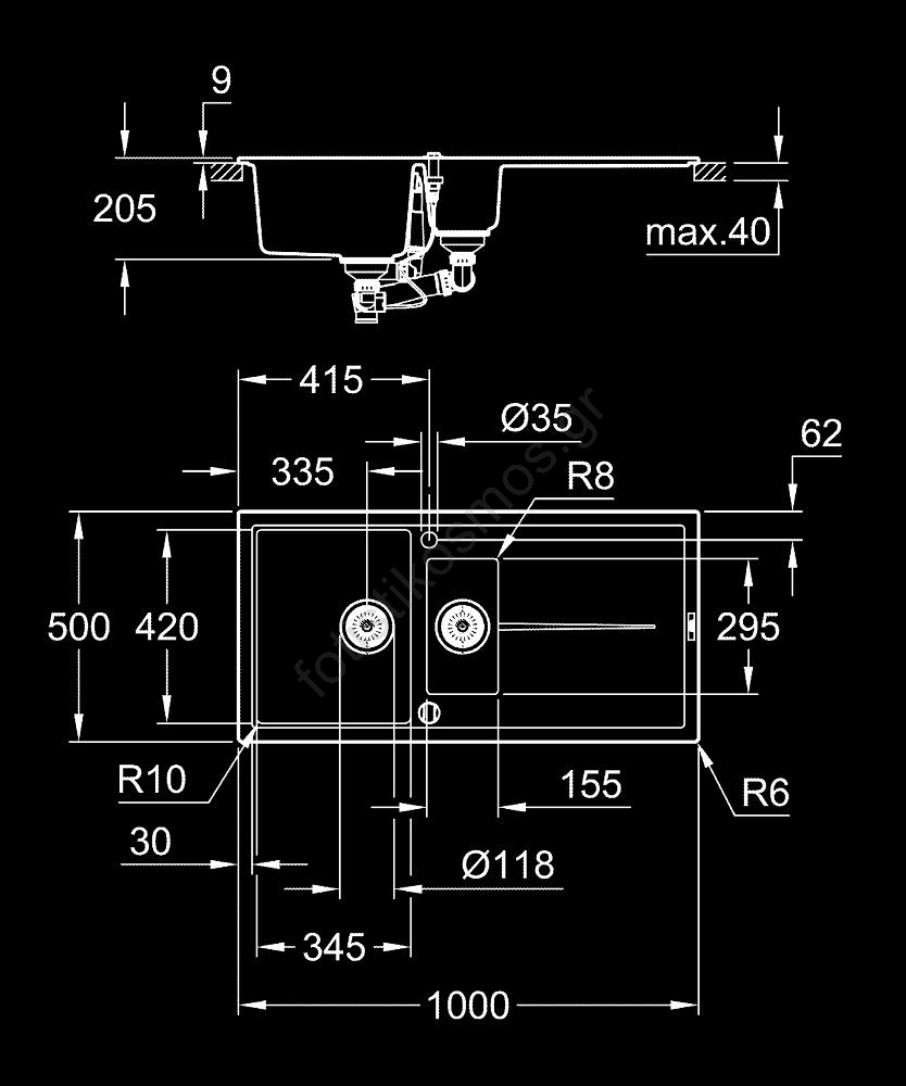 • Κύρια γούρνα διαστάσεων 335 x 420 x 205 mm και βοηθητική γούρνα 155 x 295 x 146 mm.