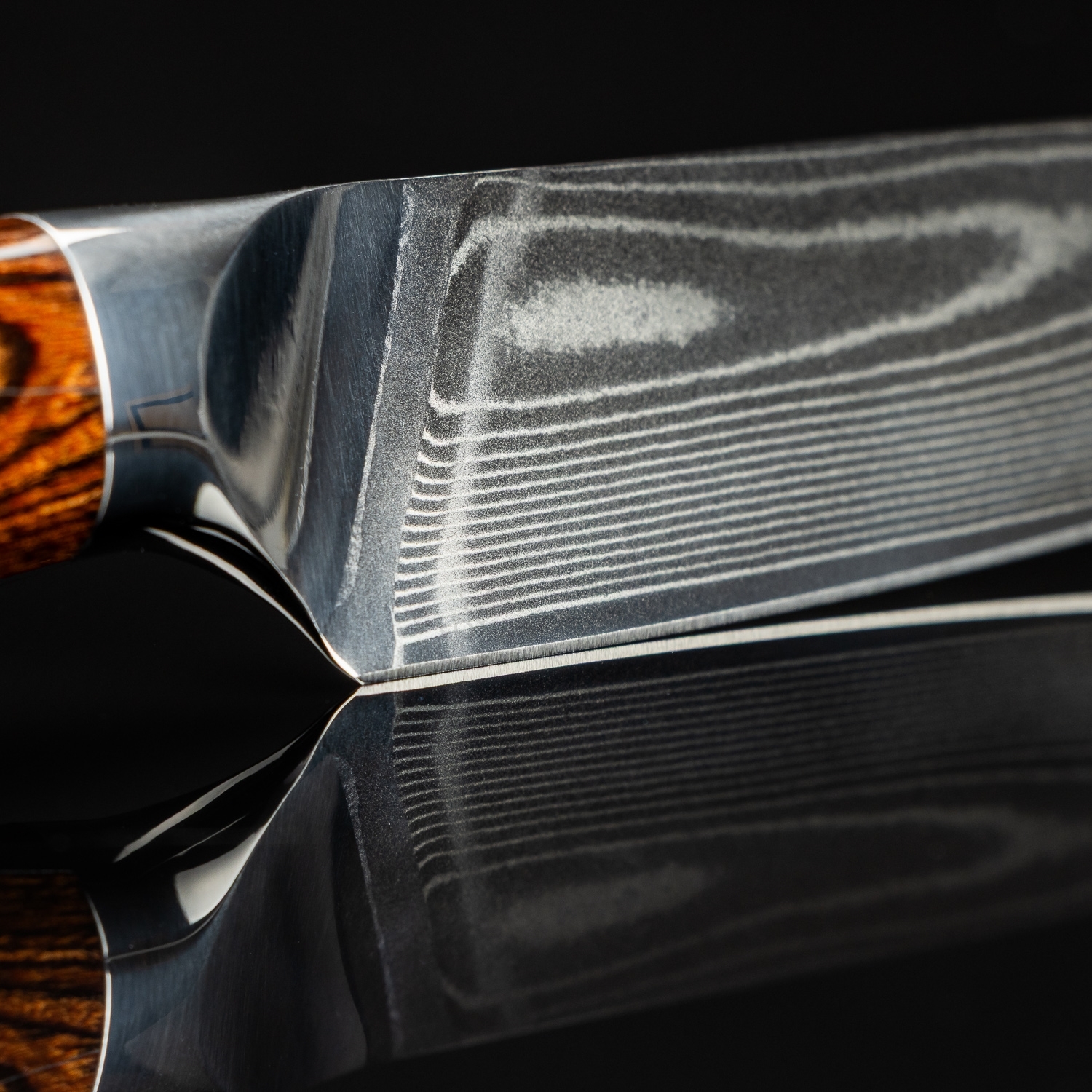 • Η λάμα μήκους 200 mm είναι κατασκευασμένη από 67 στρώσεις δαμασκηνό ατσάλι με πυρήνα VG10 – υψηλής ποιότητας ιαπωνικό ατσάλι γνωστό για την εξαιρετική σκληρότητα, αντοχή και μακρά διατήρηση της κοπής.