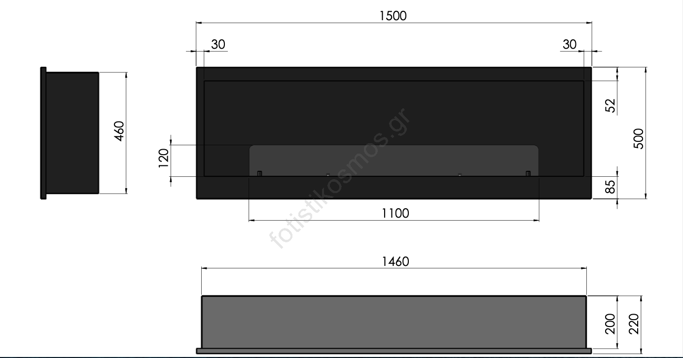 • Διαστάσεις τζακιού: 50 x 150 x 22 εκ.