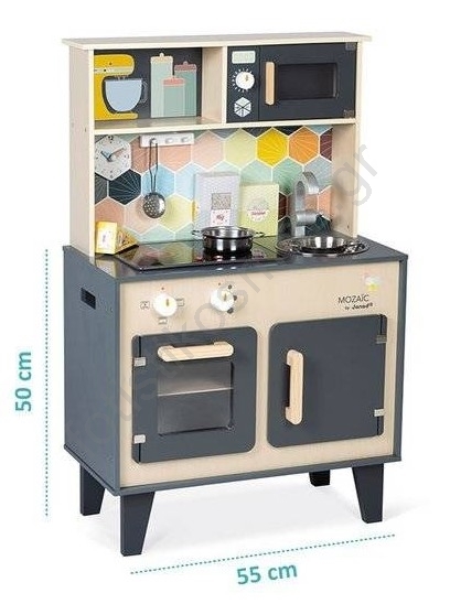 • Η μεγάλη κουζίνα Mozaic είναι κατασκευασμένη από ξύλο και διαθέτει γάντζο για εργαλεία, όπου μπορείτε να κρεμάσετε 1 κουτάλα, 1 κατσαρόλα και 1 μεταλλικό σουρωτήρι, καθώς και 3 χάρτινα κουτιά για τρόφιμα (τυρί, αλεύρι, ρύζι).