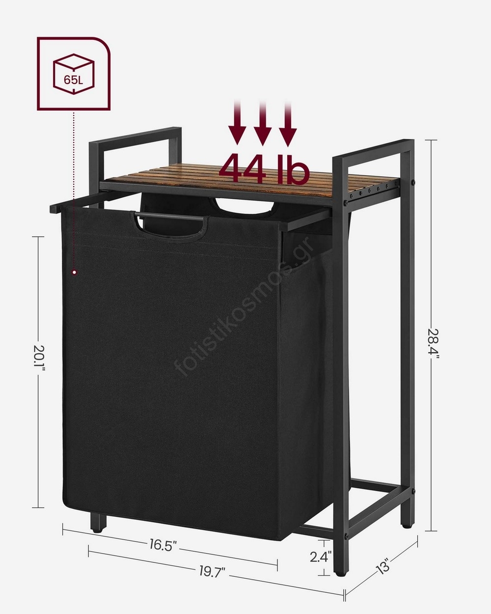 • 1 σακούλα, 1 ράφι – Αποθηκεύστε τα ρούχα στην υφασμάτινη σακούλα (65 l) και τοποθετήστε απορρυπαντικά, μαλακτικό και άλλα είδη στο ράφι από πάνω.