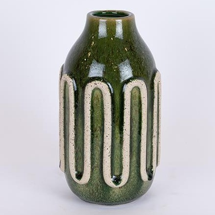 • Η σκούρα πράσινη γυαλιστερή επιφάνεια καλύπτει το μεγαλύτερο μέρος του βάζου, ενώ τα ανάγλυφα στοιχεία έχουν πιο ανοιχτό, κρεμ χρώμα.