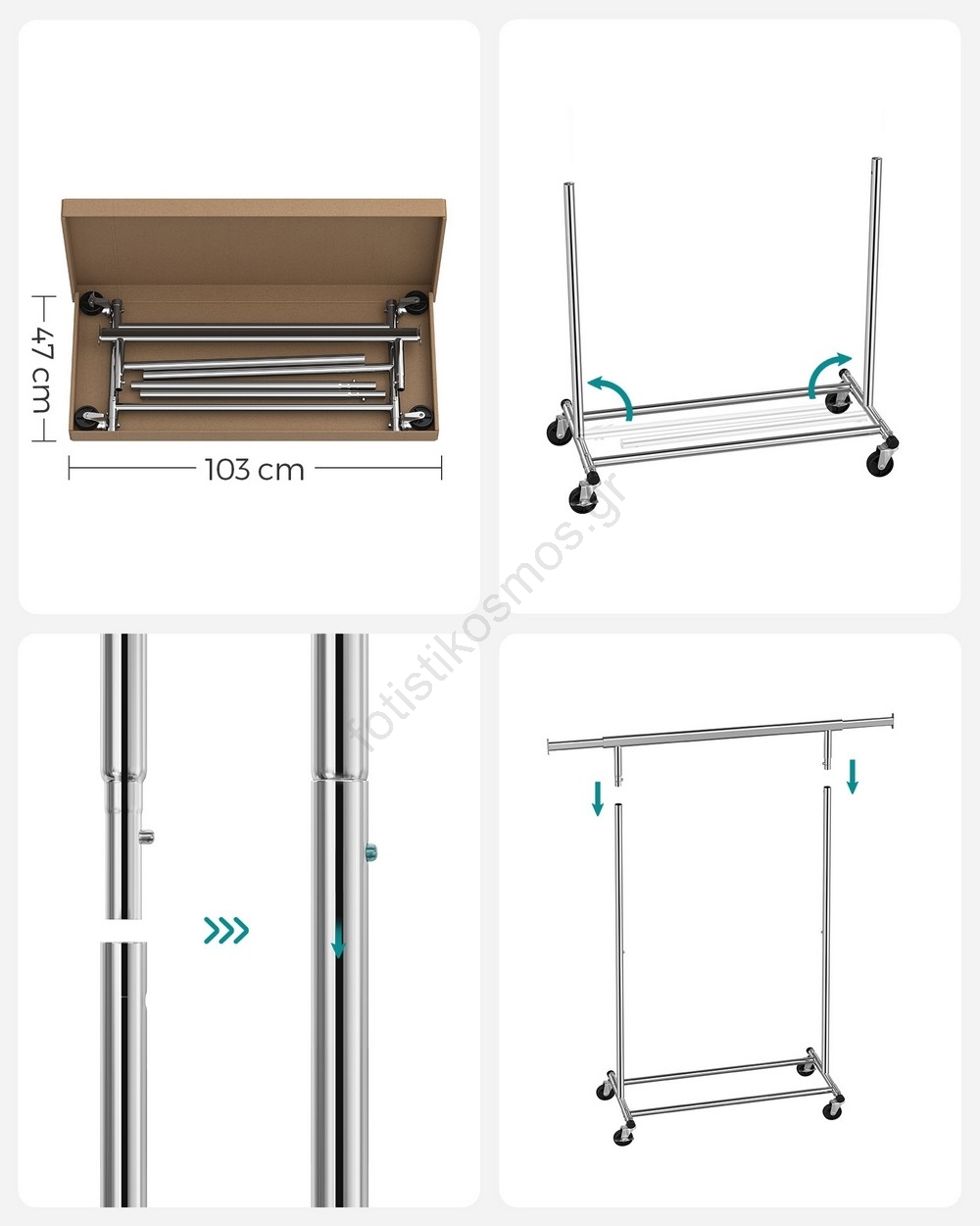 • Η πάνω ράβδος αντέχει έως και 90 kg (σε ομοιόμορφη κατανομή) χωρίς να κουνιέται ή να ανατραπεί, η τηλεσκοπική ράβδος προσφέρει επιπλέον χώρο για τα ρούχα, τα καπέλα, τις τσάντες κ.ά.