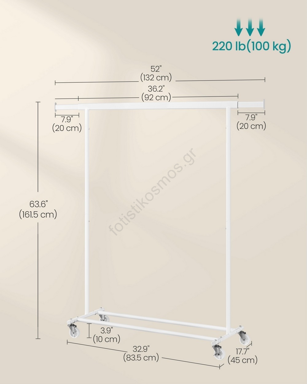 • Η επάνω ράβδος αντέχει έως 100 kg (με ομοιόμορφη κατανομή) χωρίς ταλάντωση ή ανατροπή, ενώ η επεκτεινόμενη ράβδος προσφέρει επιπλέον χώρο για ρούχα, καπέλα, τσάντες κ.λπ.