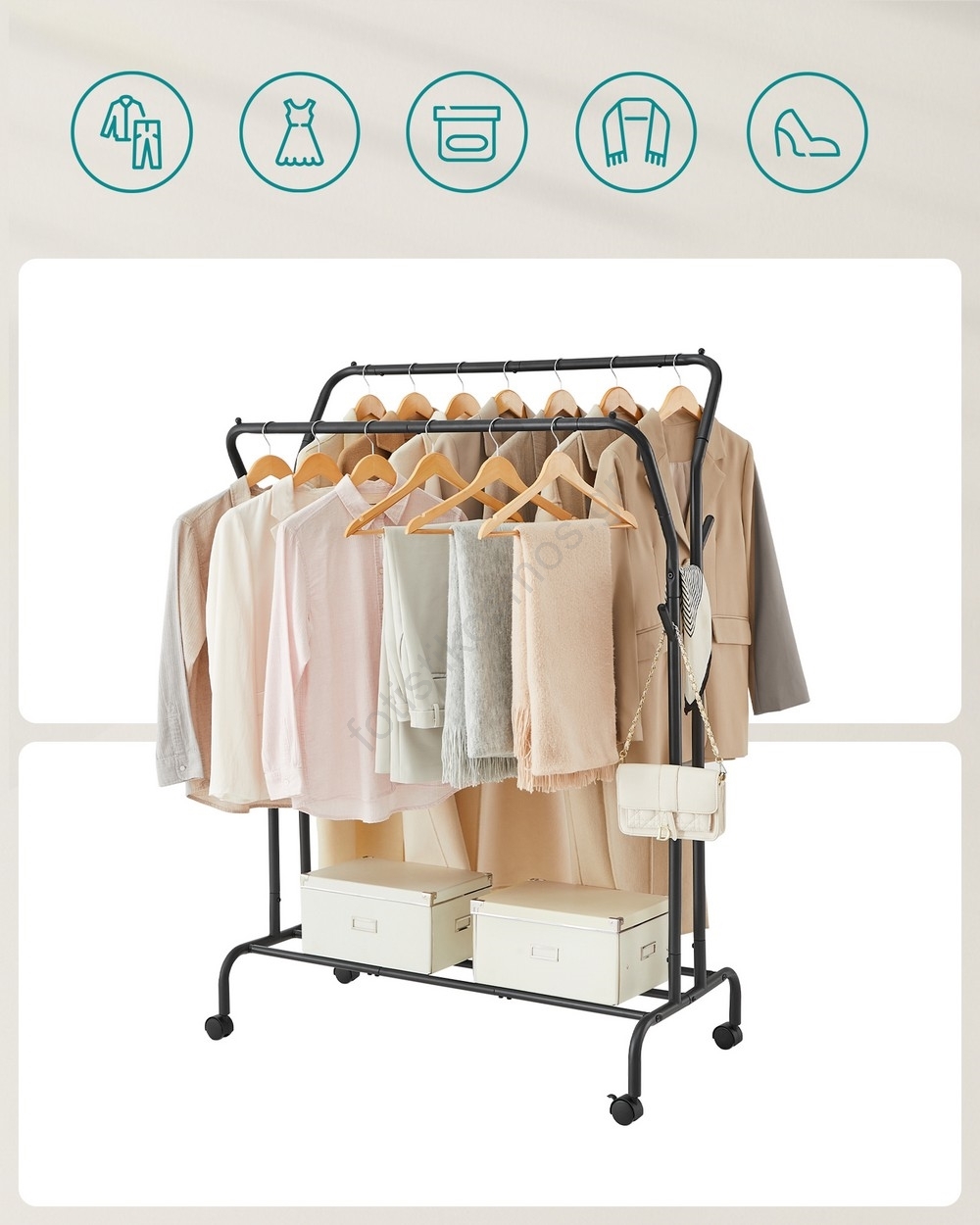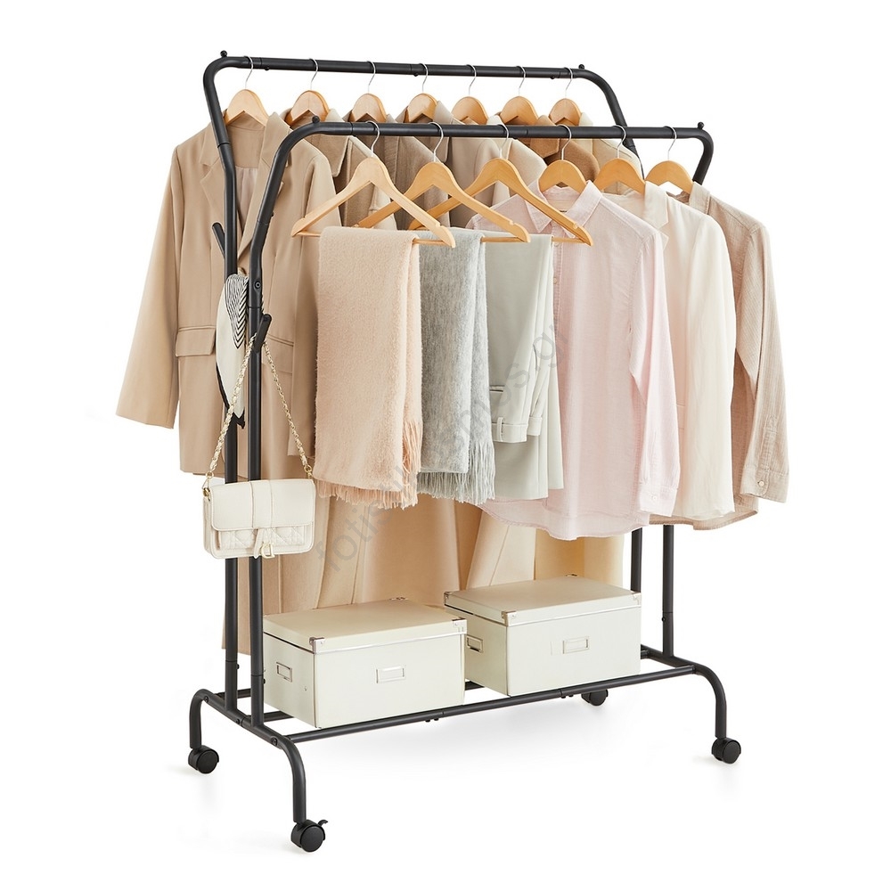• 4 ανθεκτικά ροδάκια PP (2 με φρένα) διευκολύνουν τη μετακίνηση ή την σταθερή τοποθέτηση ολόκληρης της κρεμάστρας.
