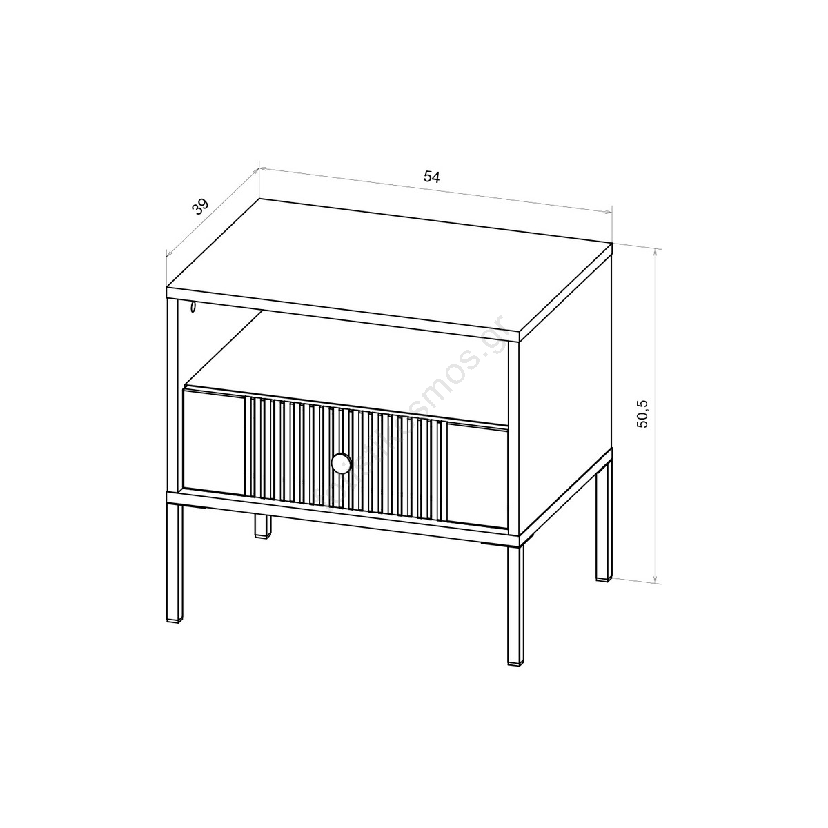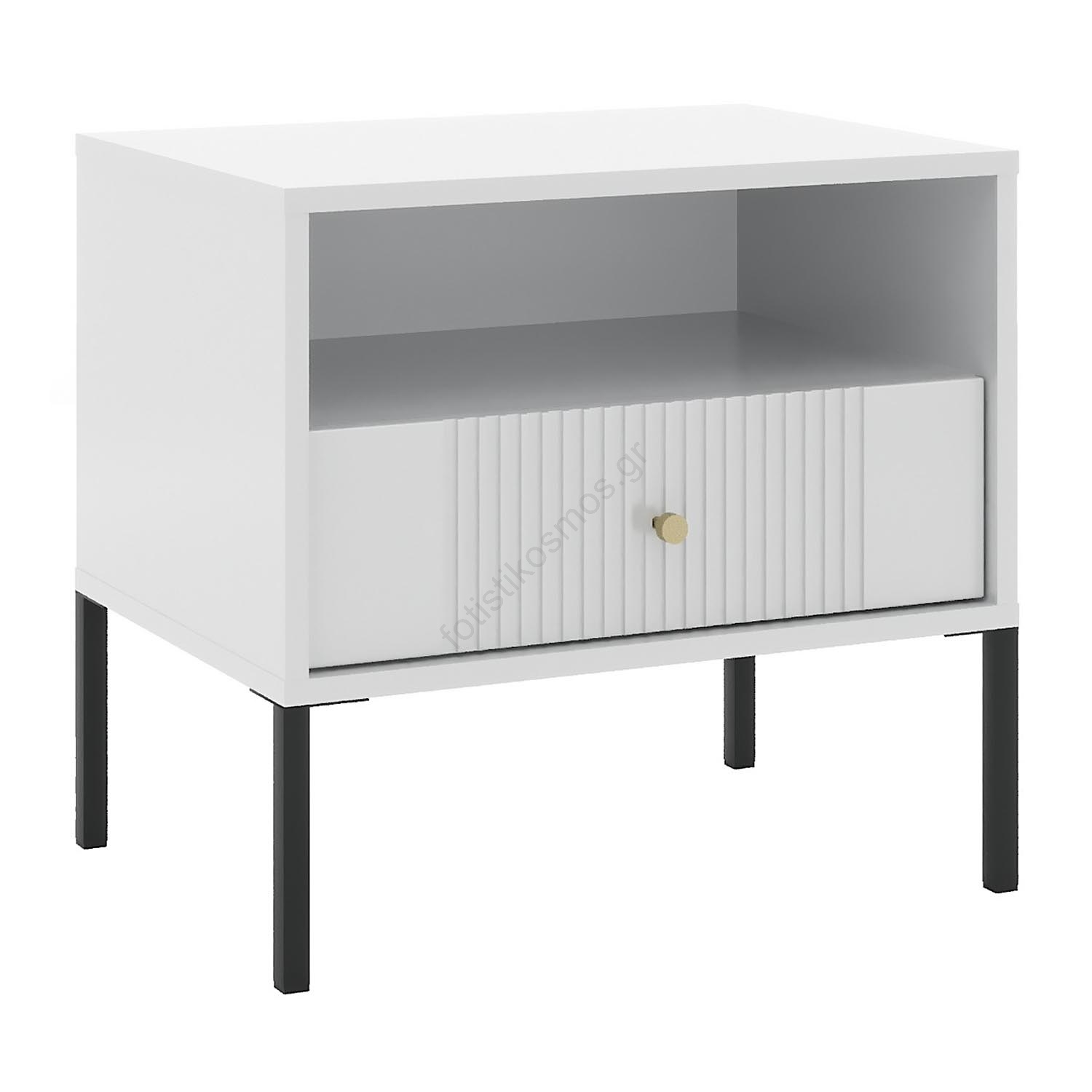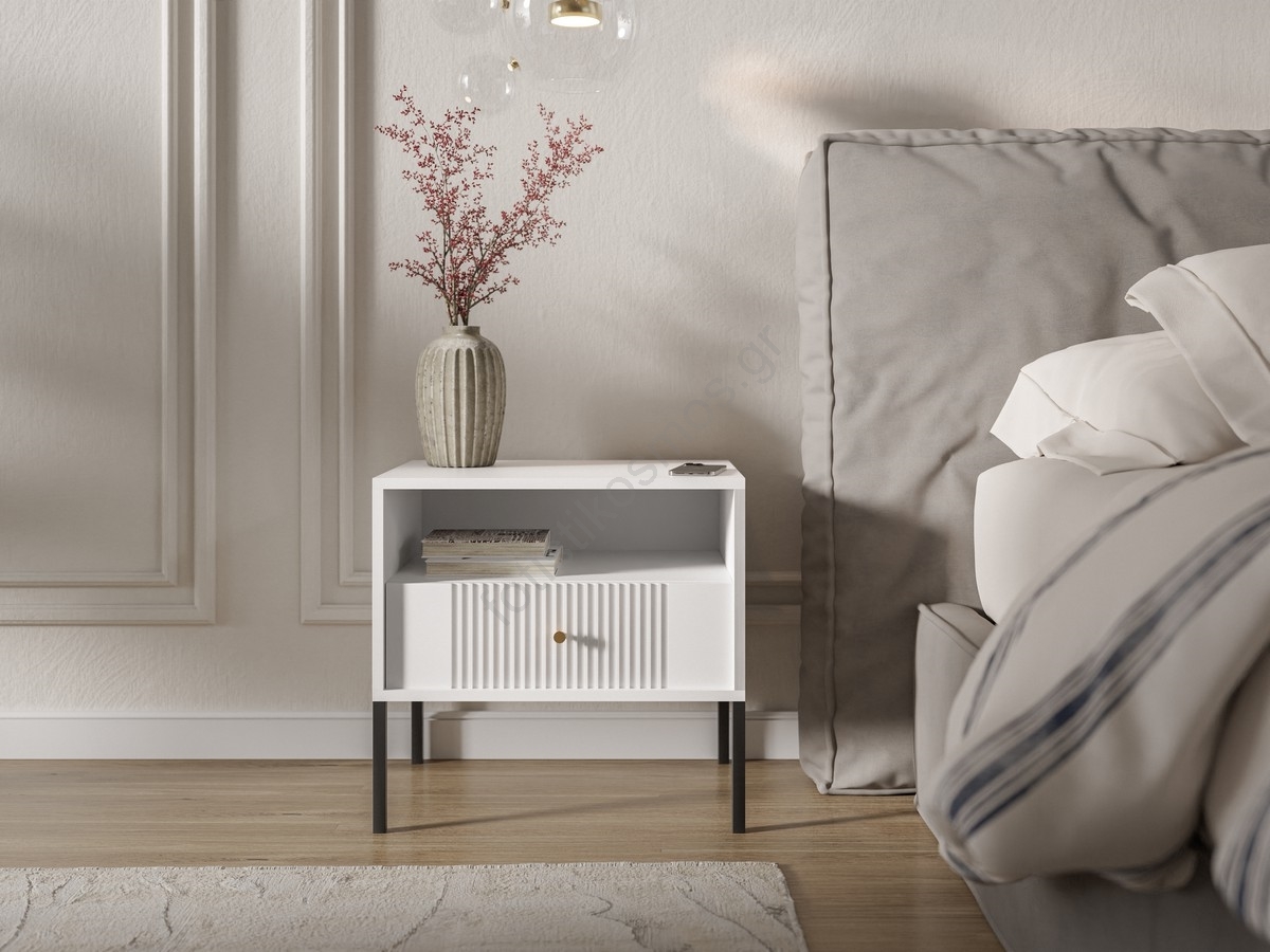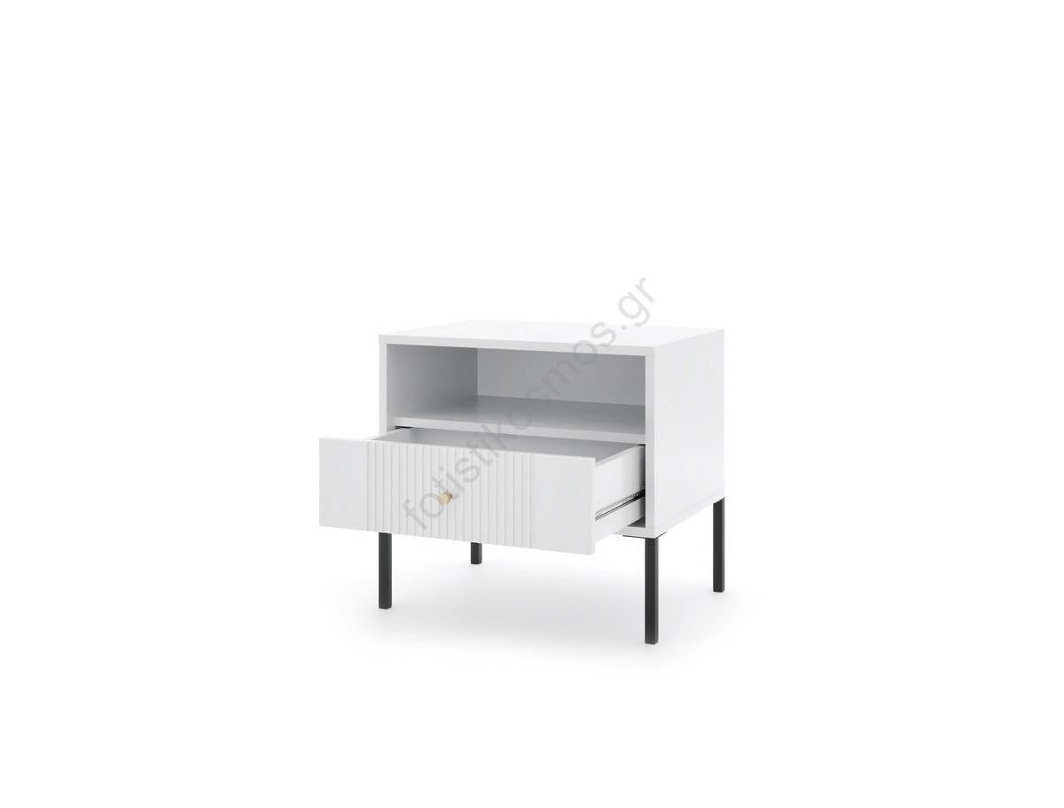 • Διαθέτει ένα ανοιχτό ράφι και ένα συρτάρι διακοσμημένο με κατακόρυφες ραβδώσεις για εκλεπτυσμένο οπτικό αποτέλεσμα.