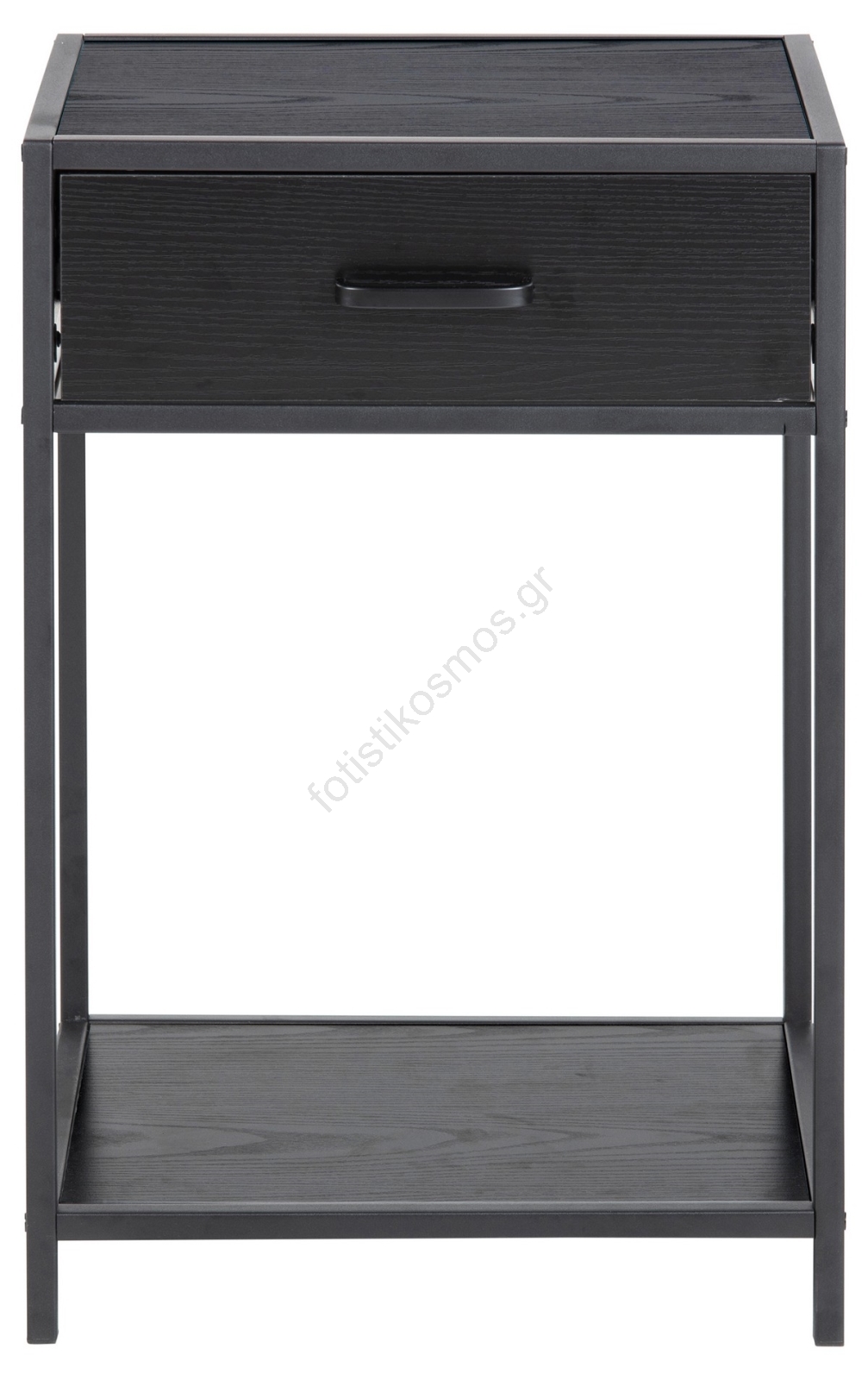 • Η επάνω επιφάνεια, το πλαίσιο, το συρτάρι και το ράφι είναι από μαύρη τραχιά μελαμίνη, ενώ η βάση είναι από μαύρο ματ χάλυβα με τραχιά βαφή πούδρας και μεταλλικούς οδηγούς.