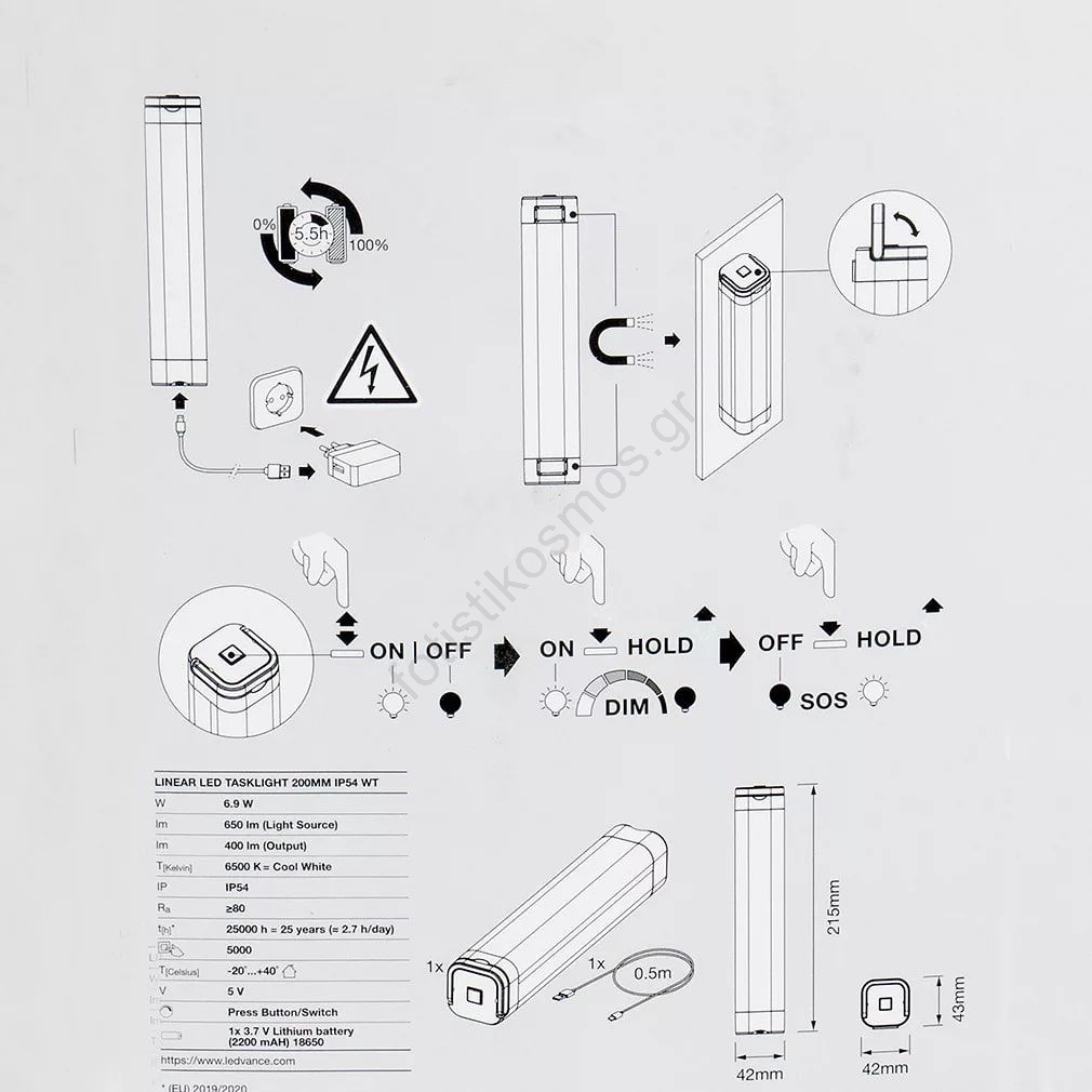 Ledvance - LED ρυθμιζόμενο φωτιστικό LINEAR LED/6,9W/5V 2200 mAh IP54 | Fotisti kosmos