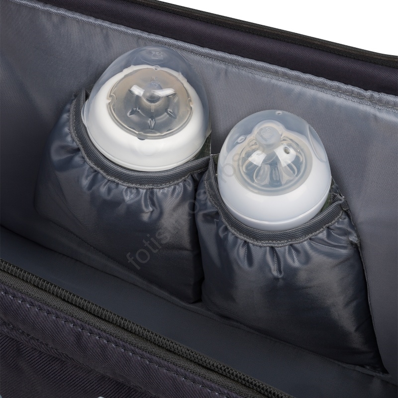 • Το εσωτερικό διαθέτει: 1 μεγάλη τσέπη με φερμουάρ, 1 μεγάλη θήκη για τα απαραίτητα της μαμάς, 2 θήκες για μπιμπερό.