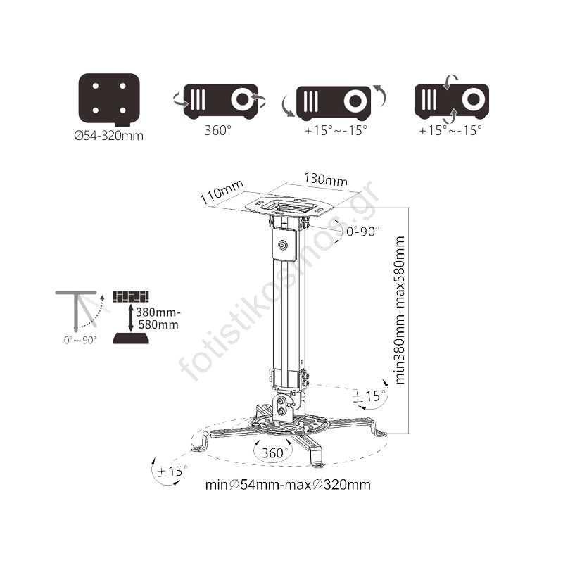 • Ρυθμιζόμενο ύψος για βέλτιστη προβολή, από 380 έως 580 mm από την οροφή.