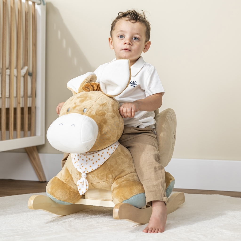 • Το λούτρινο κουνιστό ζωάκι με ξύλινη βάση και χειρολαβές είναι ένα παιχνίδι που προσκαλεί σε κούνημα και χάδι.