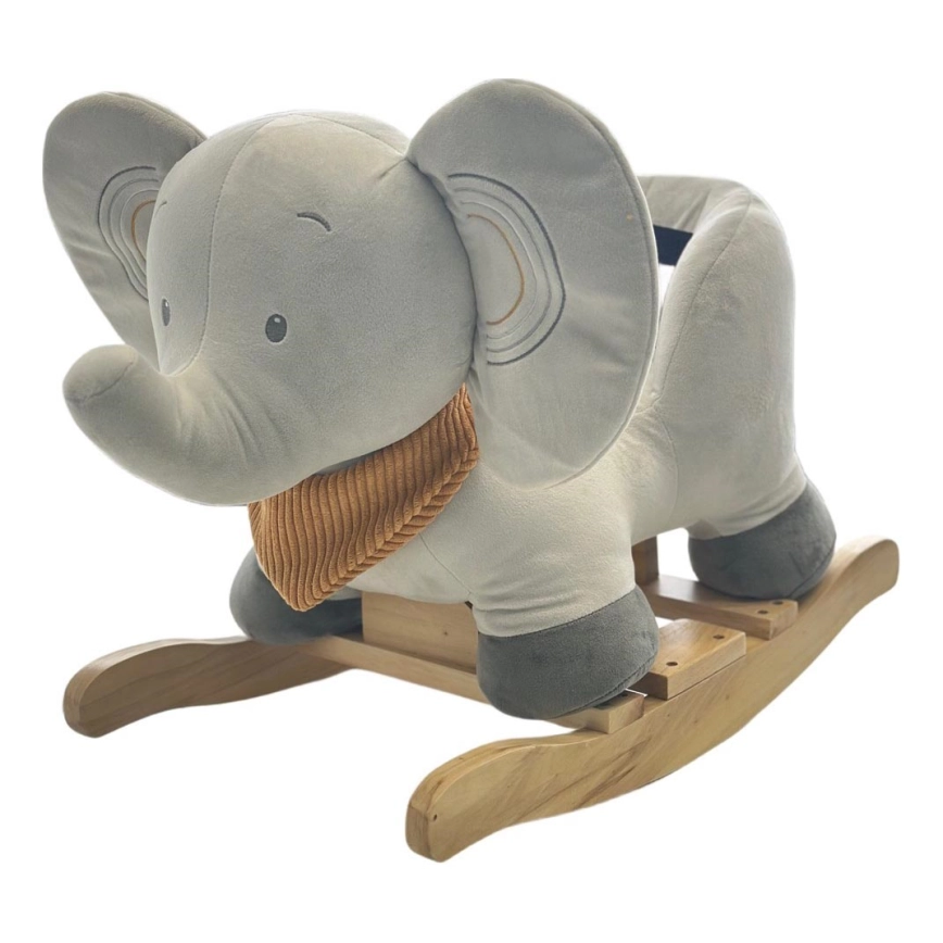 • Όμορφος μαλακός ελεφαντάκος-κουνιστήρι με ξύλινη βάση και χειρολαβές, ένα παιχνίδι που προσκαλεί σε κούνημα και χάδι.