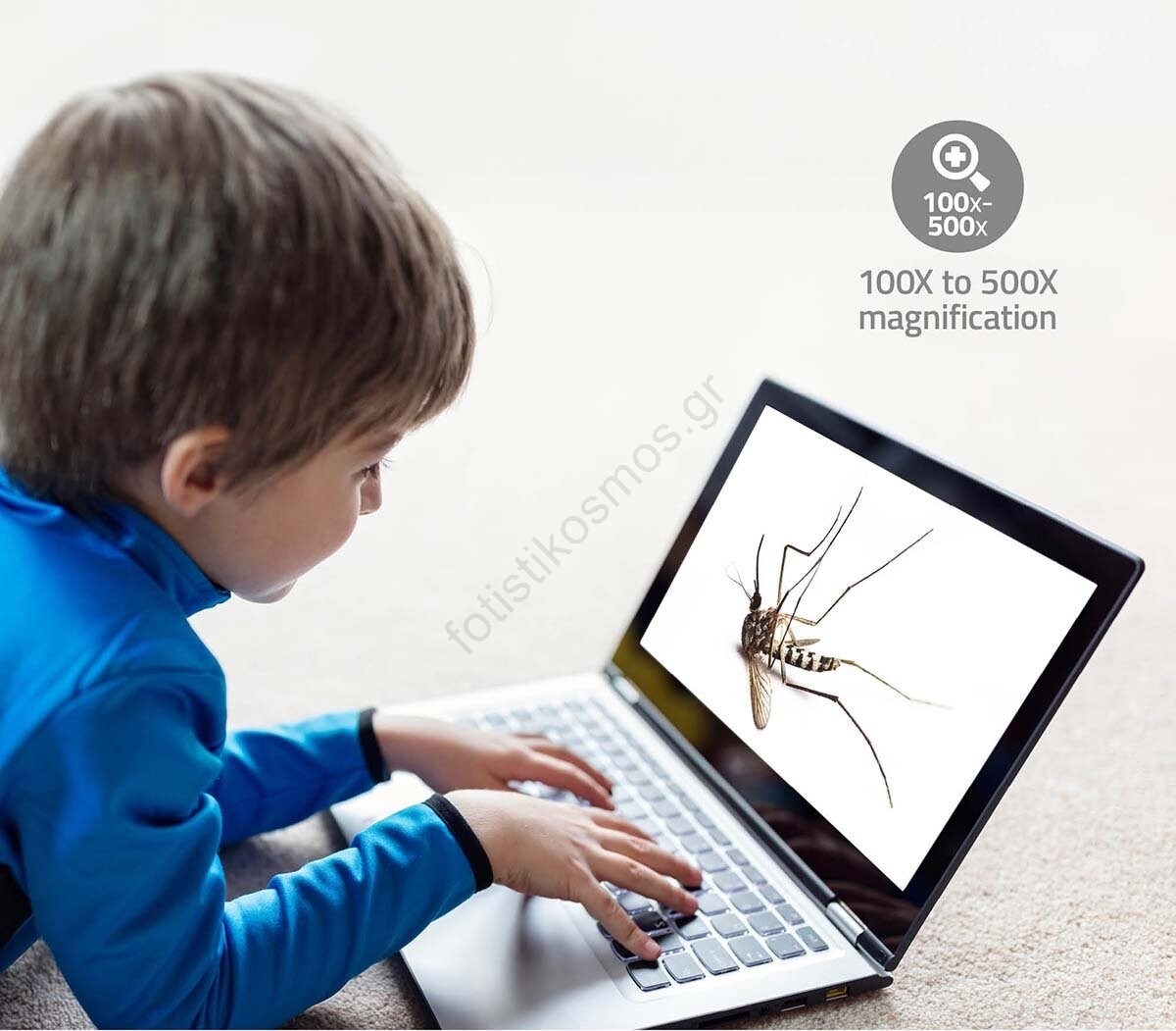 • Εύκολη μεγέθυνση (100x έως 500x) και εστίαση μέσω περιστροφικού κουμπιού.