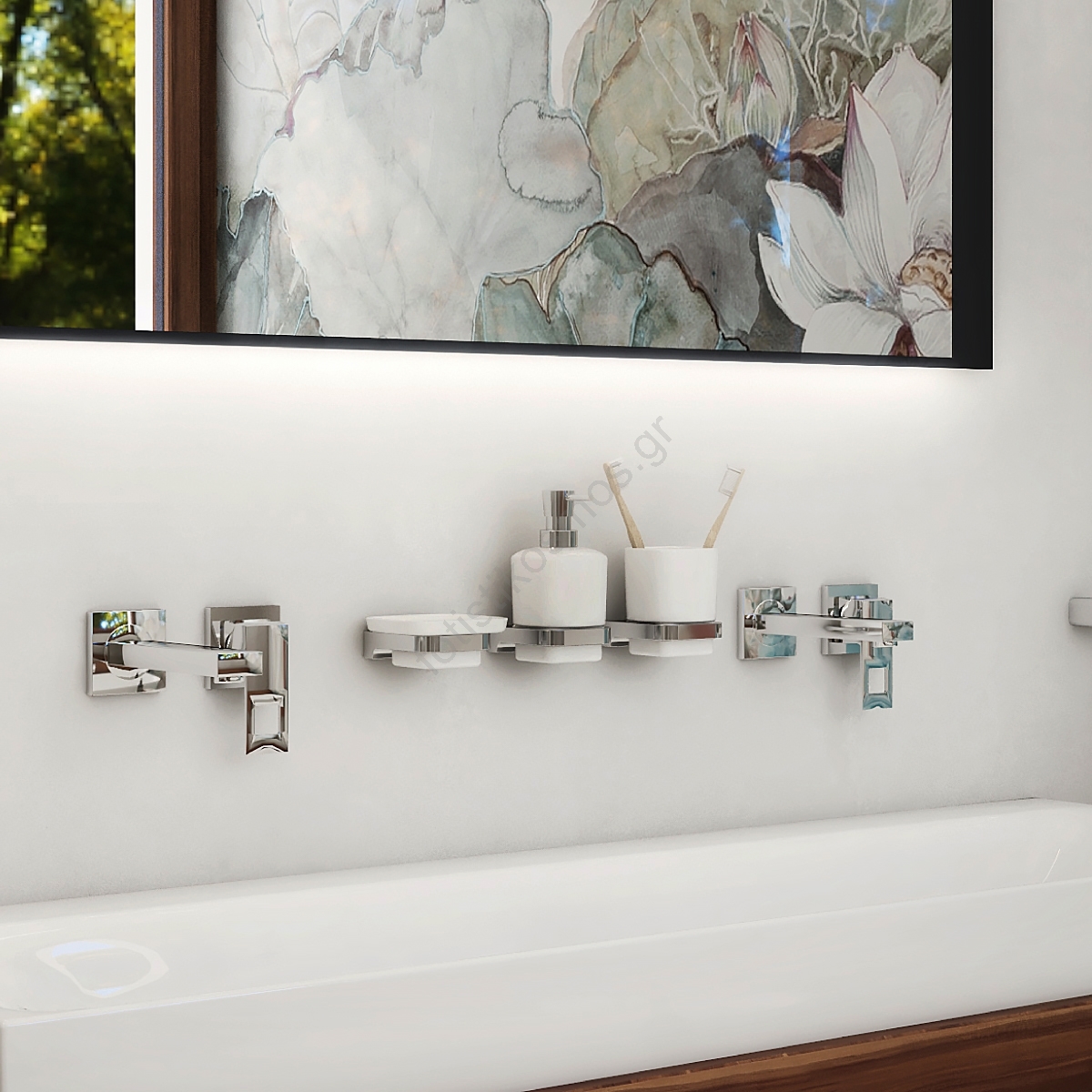 NIMCO MA set-31K-26 - Επιτοίχιος διανομέας σαπουνιού, βάση οδοντόβουρτσας και γάντζος τοίχου MAYA 320 mm λευκό/γυαλιστερό χρώμιο