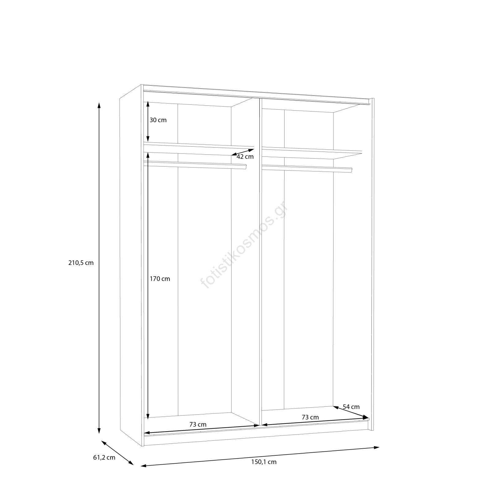 • Η ντουλάπα διαθέτει ράβδους κρέμανσης, ράφια και μεγάλο αποθηκευτικό χώρο για τα ρούχα, τις τσάντες και τα εποχιακά αντικείμενα.