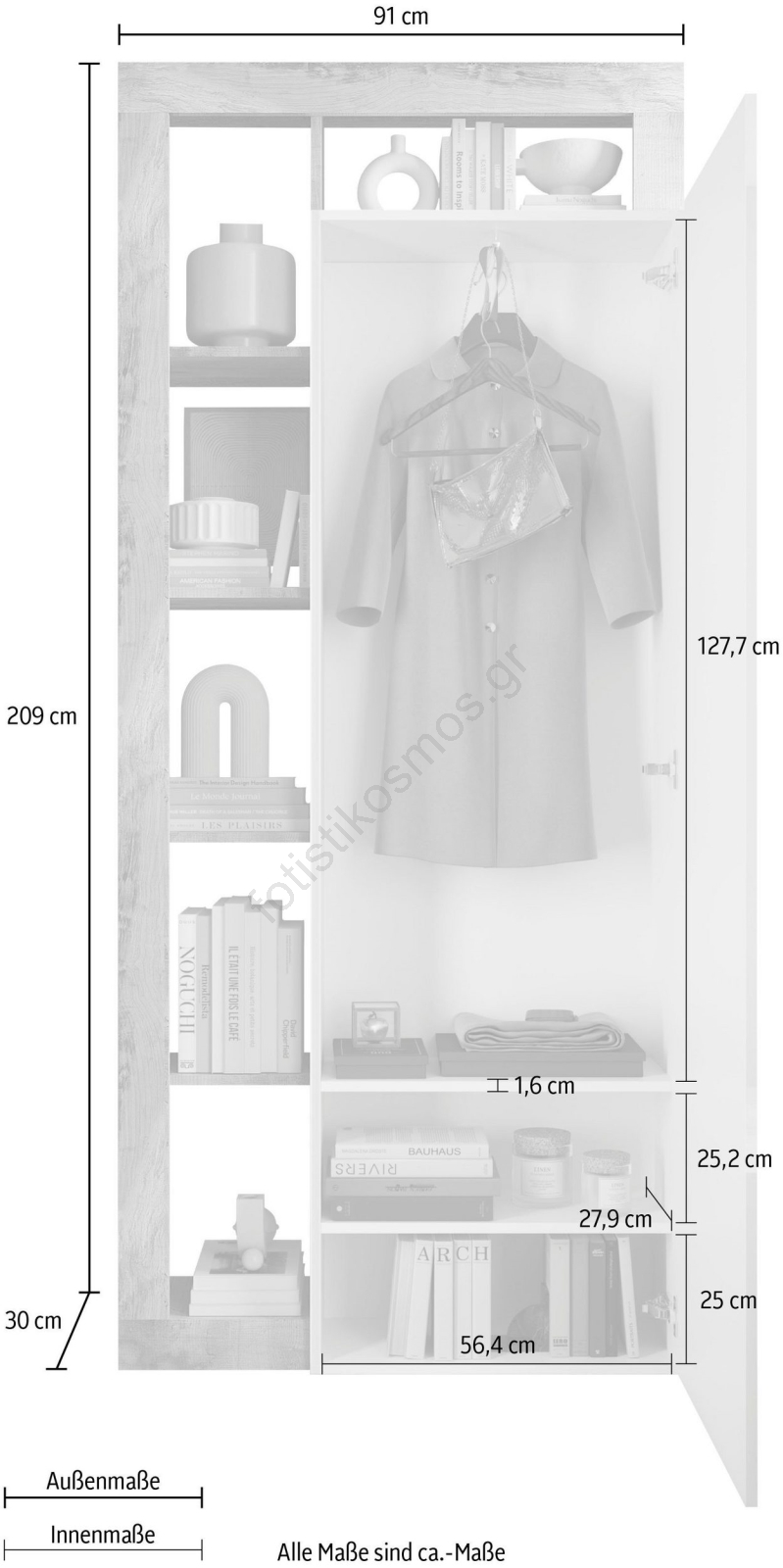 • Η ντουλάπα διαθέτει 6 ανοιχτά ράφια, ράβδο ρούχων και 2 εσωτερικά ράφια για την αποθήκευση τσαντών και εποχιακών ειδών.