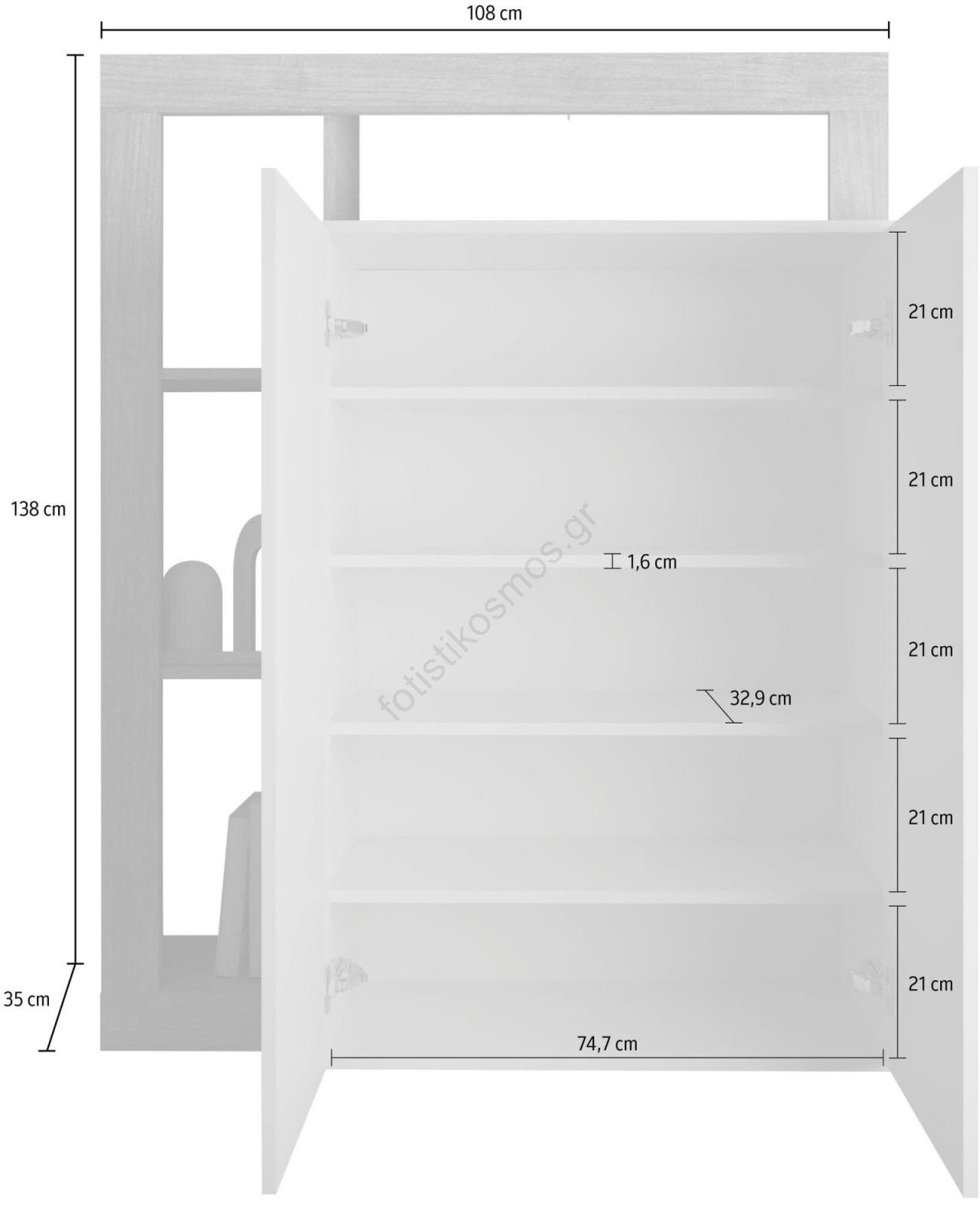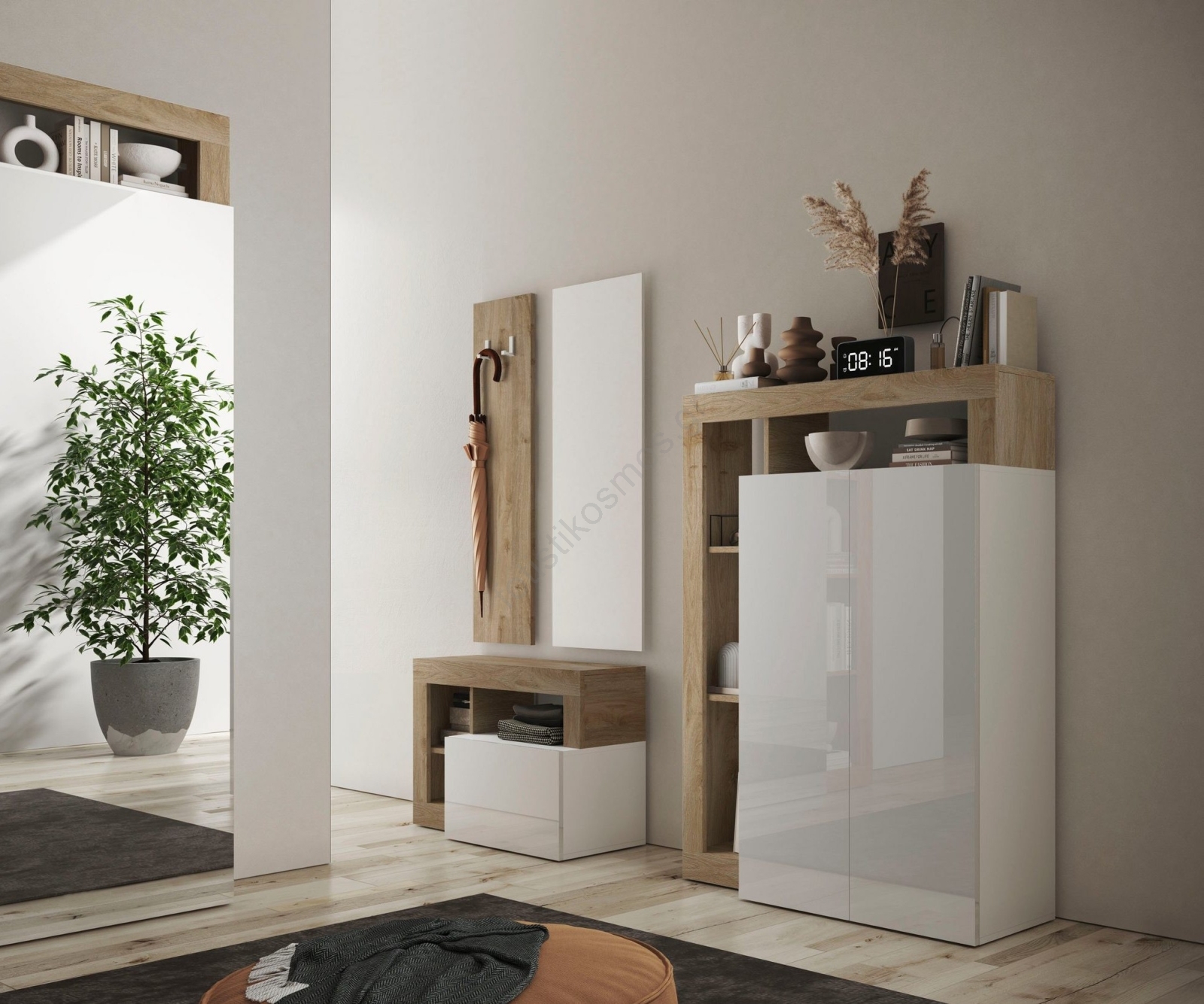 • Διαθέτει 4 ανοιχτά ράφια και 5 εσωτερικές θήκες για την αποθήκευση τσαντών, παπουτσιών και εποχιακών ειδών.