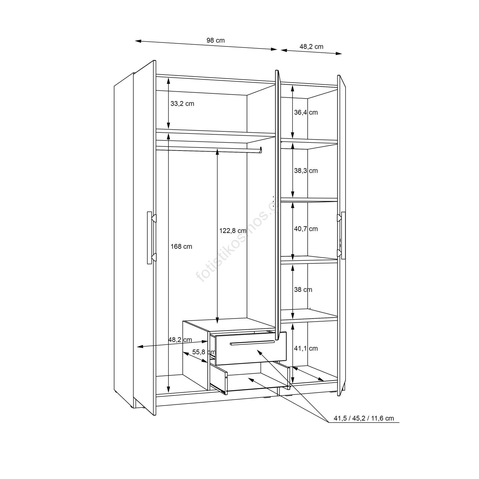 • Η ντουλάπα διαθέτει ράγα κρεμάστρας, συρτάρια, ράφια και μεγάλο αποθηκευτικό χώρο για τα ρούχα, τις τσάντες και τα εποχιακά αντικείμενά σας.