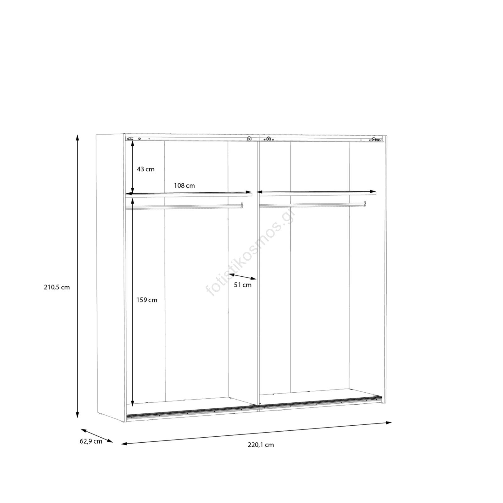 • Η ντουλάπα διαθέτει ράβδους για κρεμάσματα, ράφια και μεγάλο χώρο αποθήκευσης για τα ρούχα, τις τσάντες και τα εποχιακά αντικείμενα.