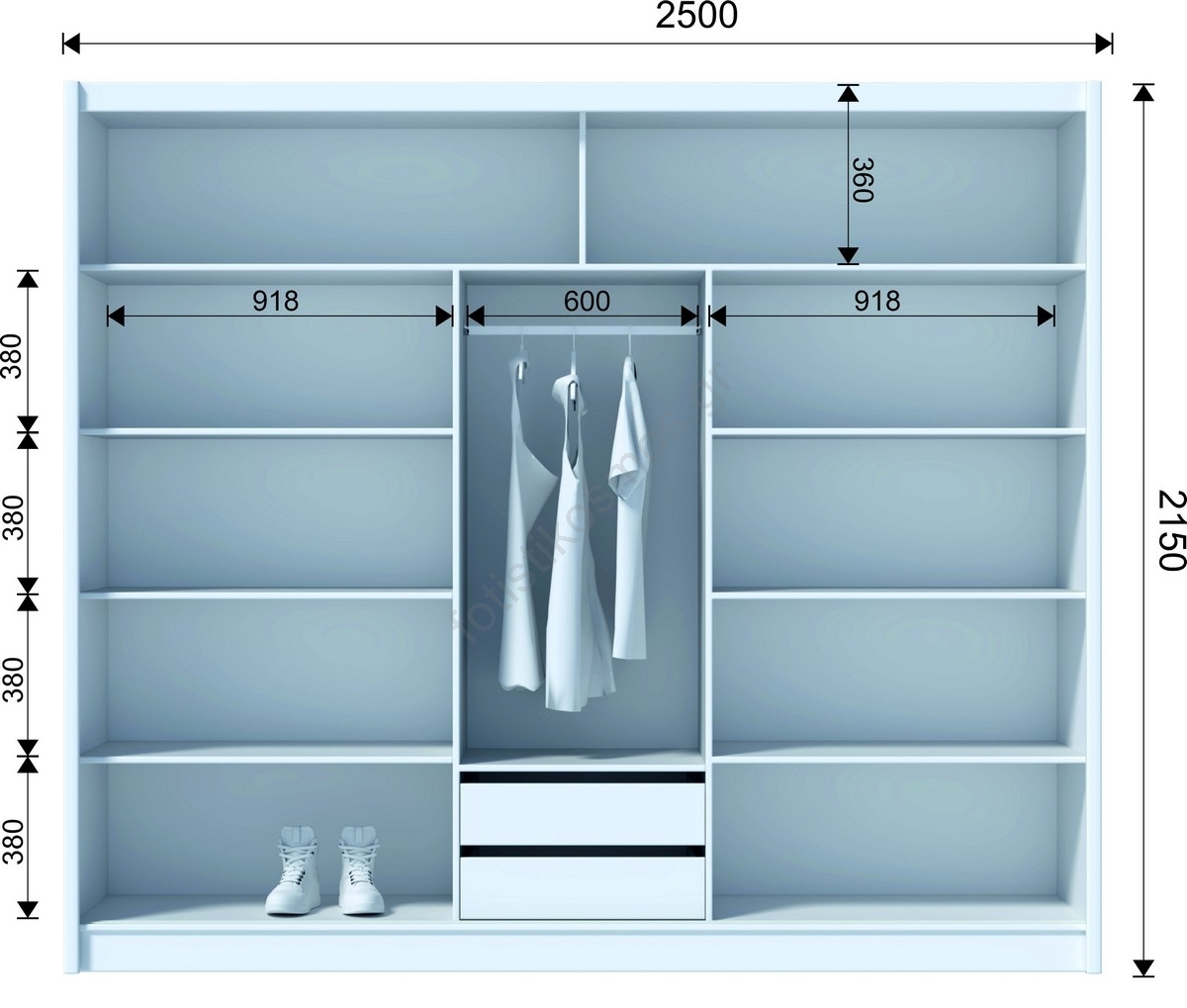 • Η ντουλάπα διαθέτει 8 ανοιχτά ράφια, 2 συρτάρια, ράγα για ρούχα και 2 επάνω ράφια για την αποθήκευση τσαντών και εποχιακών αντικειμένων.