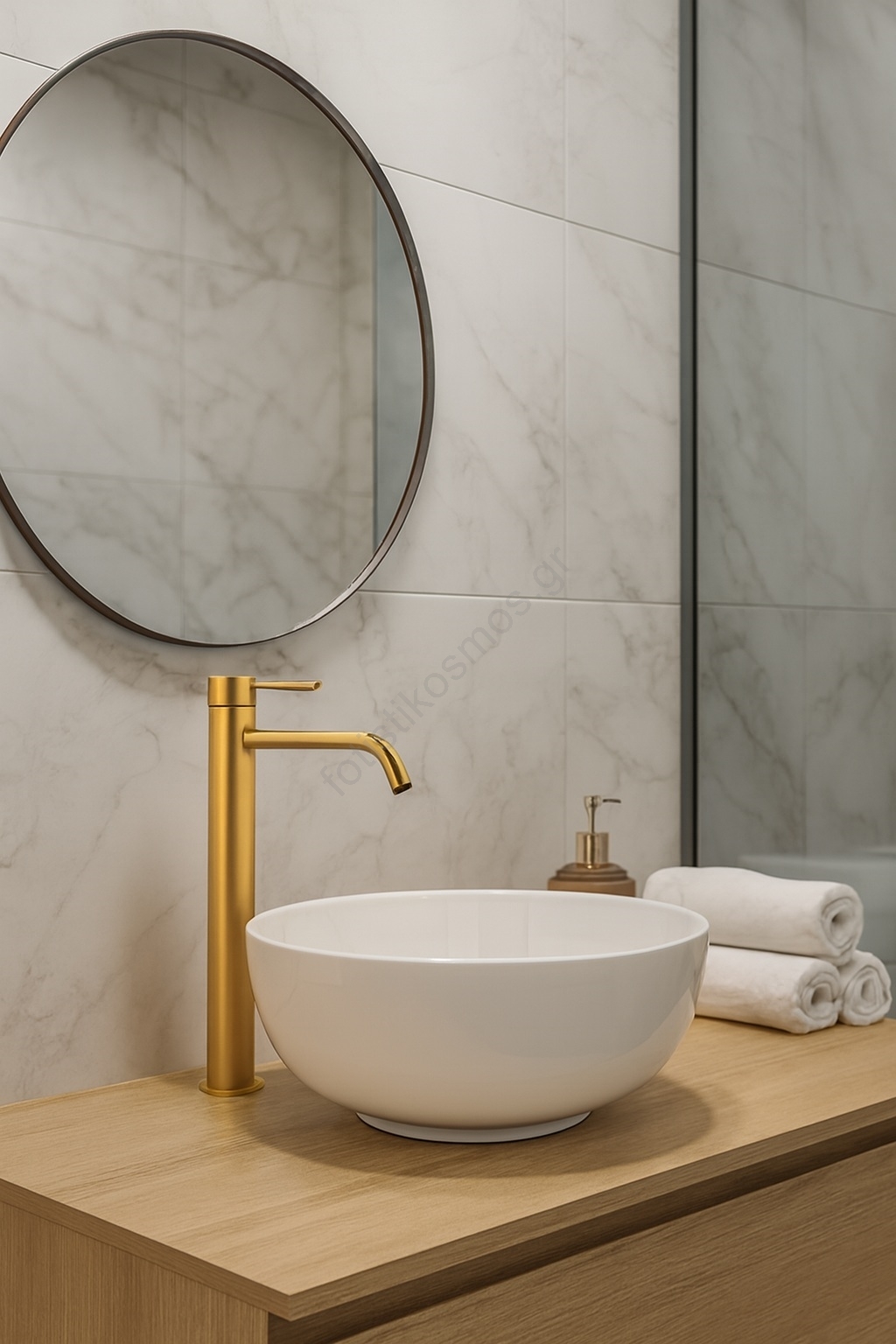 • Υψηλή επιτραπέζια μπαταρία νιπτήρα με μοχλό χειρισμού.