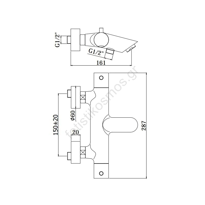 • Κεντρική απόσταση τοποθέτησης: 150 mm.