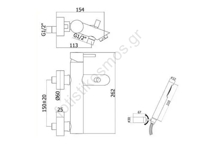 • Επιτοίχια μπαταρία μπανιέρας με μοχλό και σετ ντους.