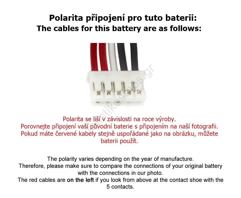 • Προειδοποίηση: Η πολικότητα διαφέρει ανάλογα με το έτος κατασκευής. Συγκρίνετε τη σύνδεση της αρχικής σας μπαταρίας με τη σύνδεση στην εικόνα στη γκαλερί. Εάν έχετε κόκκινες καλωδιώσεις διατεταγμένες όπως στην εικόνα, μπορείτε να χρησιμοποιήσετε τη μπαταρία.